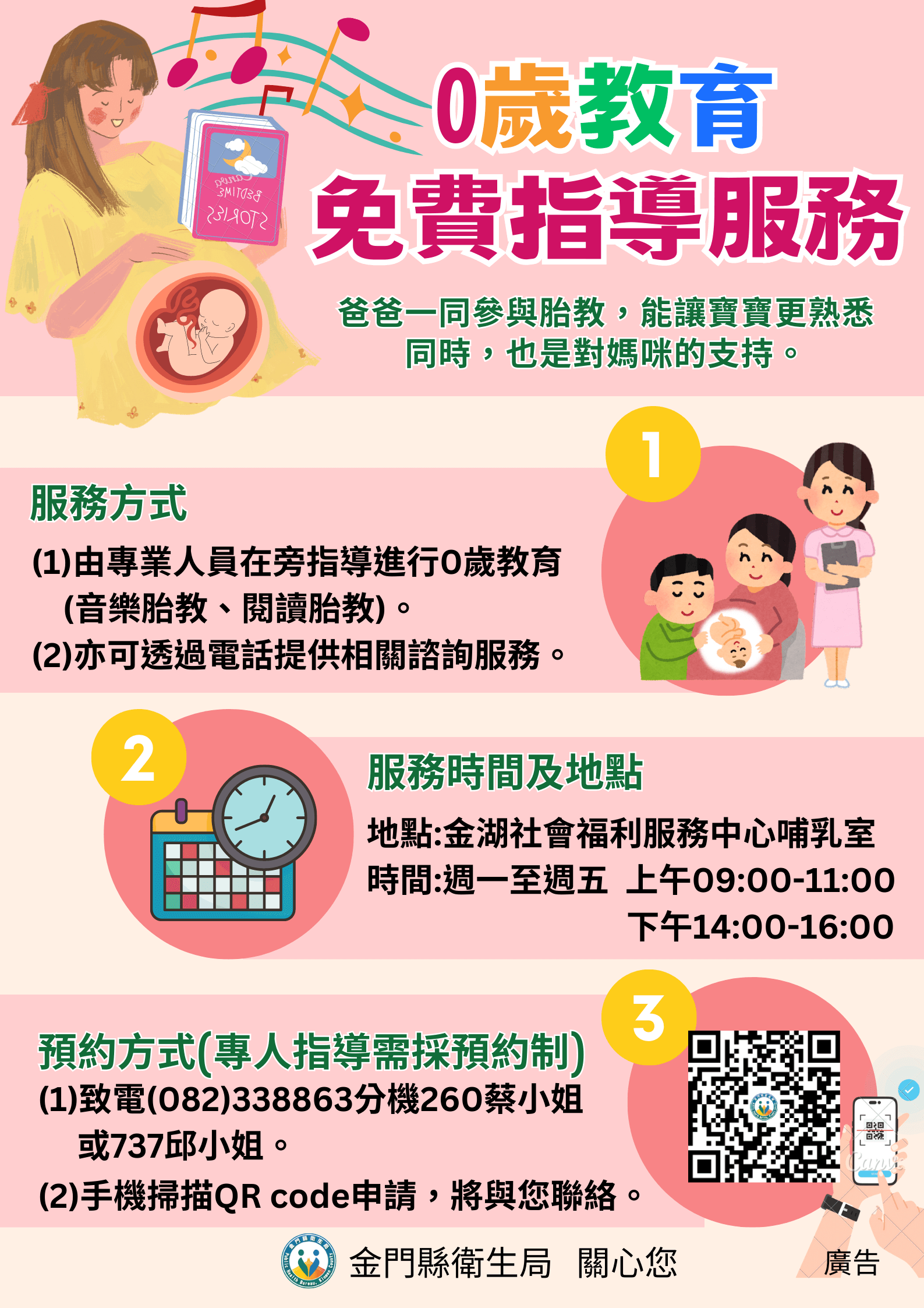 衛生局表示,0歲胎教指導服務地點設置於金湖鎮社會福利服務中心哺集乳室內(衛生行政大樓2F;金湖鎮新市里中正路1-1號),備有懷孕生產、胎兒教育訓練、故事繪本等相關書籍,為使孕媽咪能在胎教進行過程中放鬆心情,另準備藍芽故事機,可依孕媽咪喜好播放多首古典胎教音樂。若準父母有興趣想瞭解0歲胎教進行方式,可上網預約專人服務(網址: https://reurl.cc/QX0Dy5)或掃描海報上QR code進入預約頁面,服務時間:每週一至週五(上午9時至11時、下午14時至16時),另提供0歲教育線上諮詢專線,請洽詢電話082-338863轉260蔡小姐或737邱小姐,由專業人員提供線上諮詢指導。
