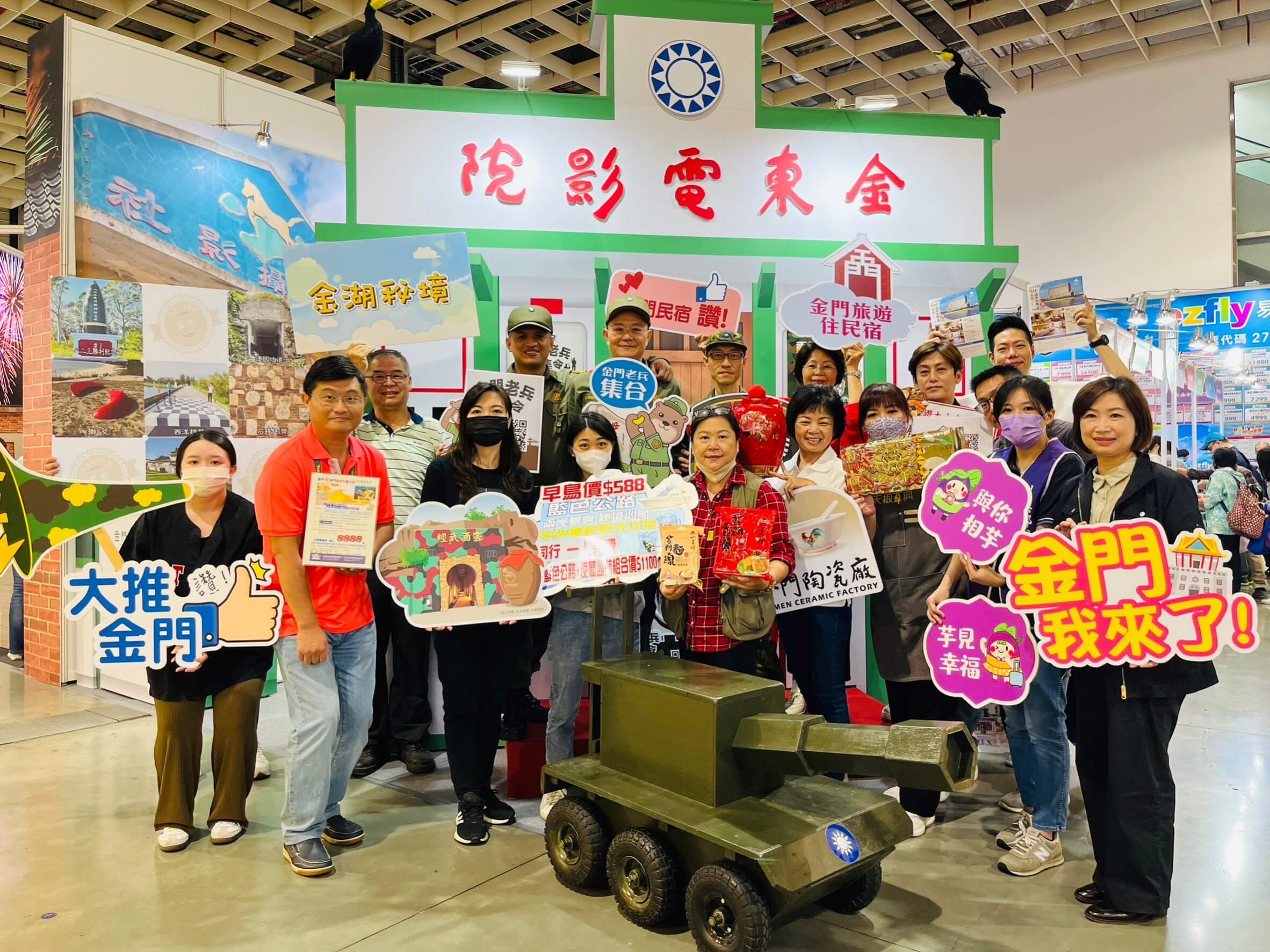 金門觀光處表示,為宣傳「金門老兵召集令」活動,台北旅展-金門館特別把最夯拍照打卡熱點「金東電影院&陽翟老街」搬到現場會場,加上金門各隊徽標誌營造,以及於旅展期間邀請到穿著草綠服的正港金門老兵志工協助活動宣傳,盛情迎接老兵返金,重溫軍旅回憶。同時,金門館開幕活動上,加碼送機票(金門臺灣來回機票一組),並在旅展現場還有宣傳烈嶼鄉芋頭季、金湖鎮喊泉及金門馬拉松等多元精彩活動;另外,冬季限定景緻候鳥「鸕鶿」整齊飛舞的震撼景象,以及無敵海景藍色公路遊程,無不精彩好玩!