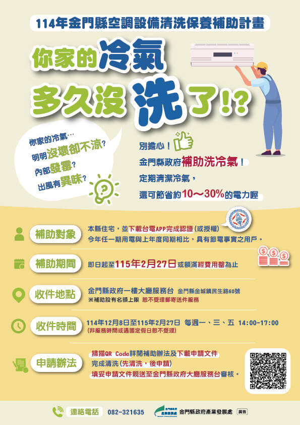 為提升家戶空調使用效能、減少能源浪費及降低家庭電費支出,金門縣政府即日起推出「114年空調設備清洗保養補助計畫」。凡符合資格者,每台冷氣清洗後可申請1,500元補助,申請期間自114年12月8日起至115年2月27日止,限額500台,額滿將提前公告停止受理。