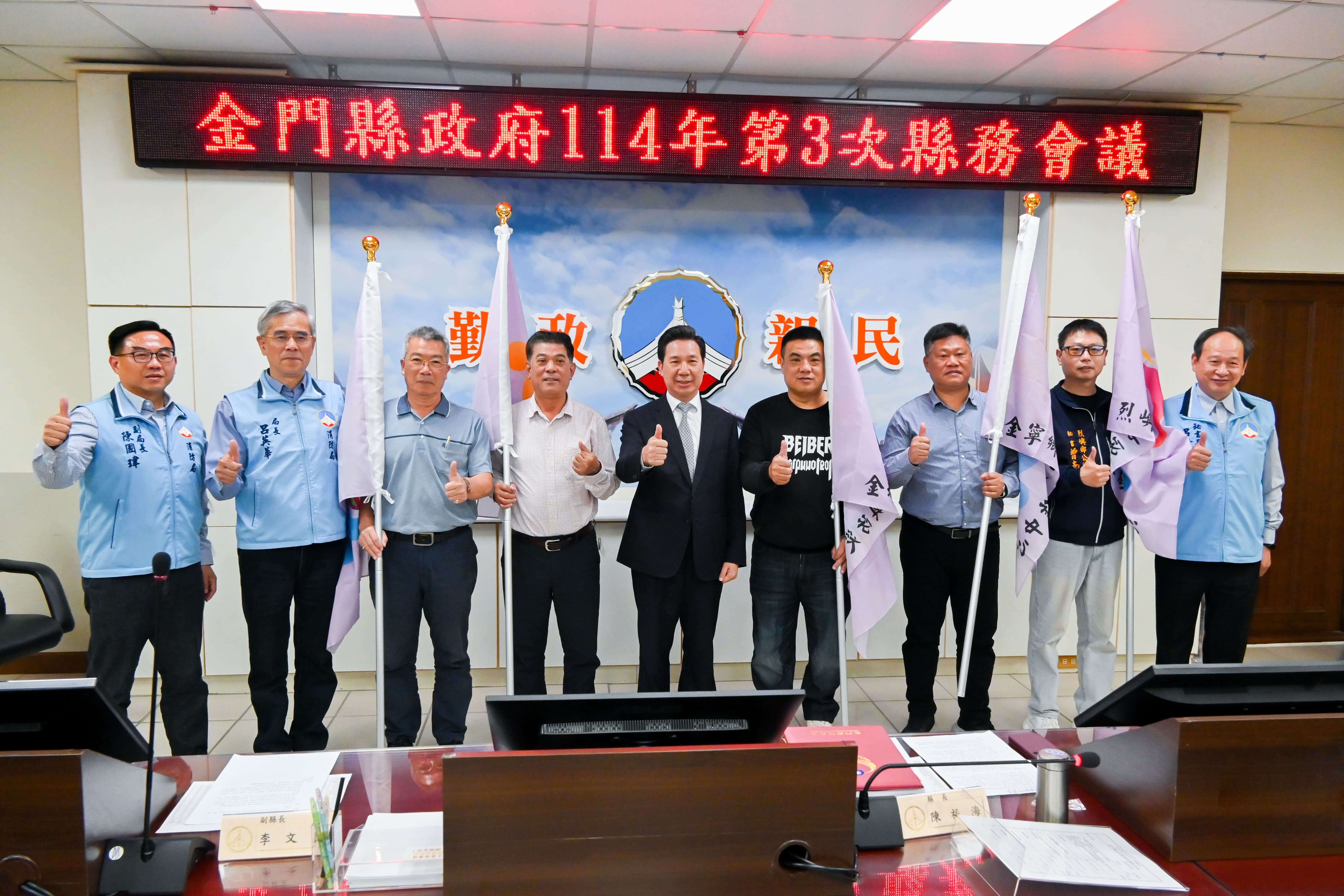 今日會前先由財政處及觀光處進行獻獎儀式,包括金門縣榮獲「113 年度私劣酒品查獲量」全國第七名及金門縣榮獲交通部 114 年度「台灣好行」服務管理及服務品質優化作業案之績優單位及業者。陳福海表示,相關成果展現團隊努力,也成為縣政持續精進的重要動力。