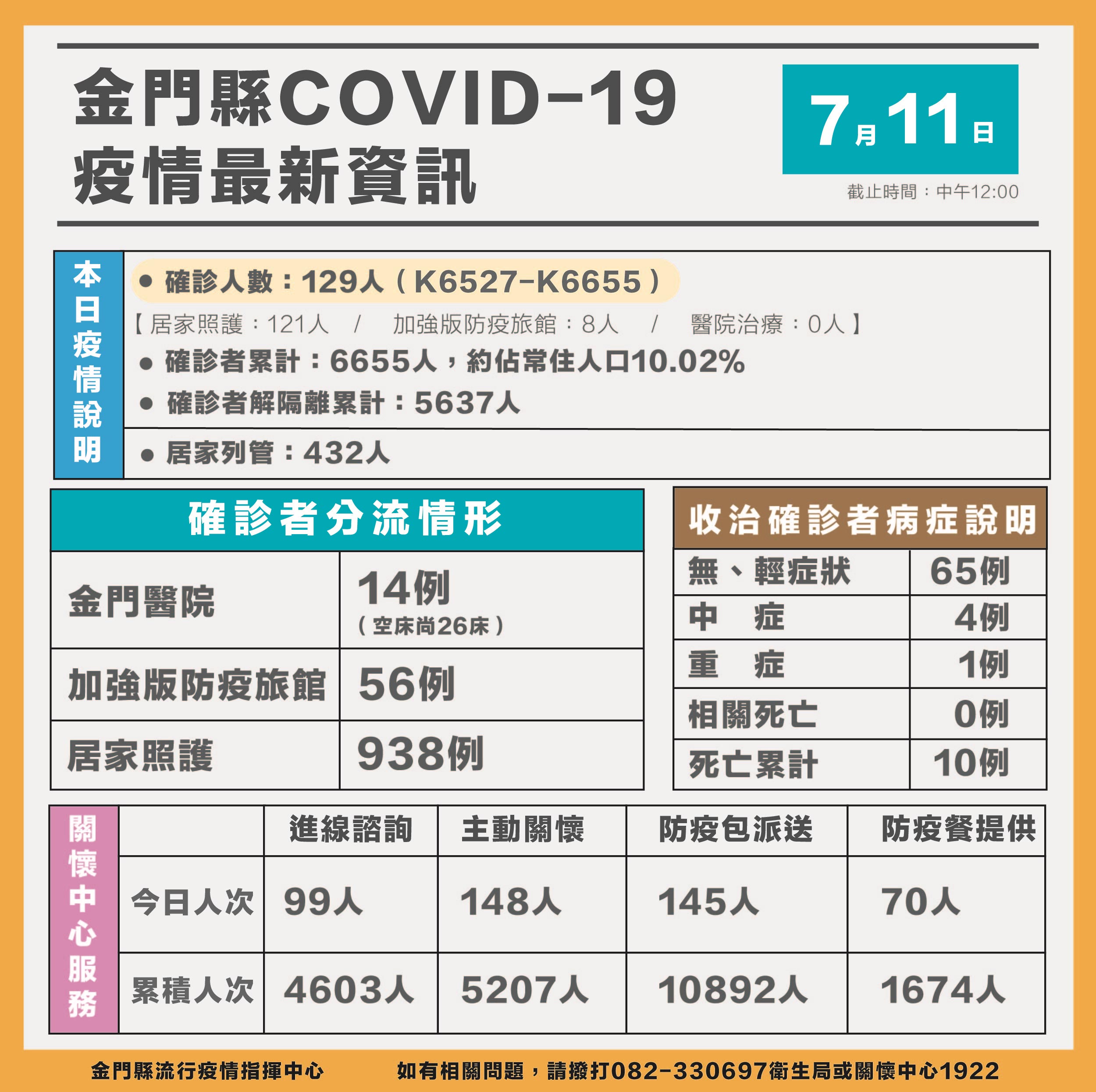今日居家照護關懷中心,來電諮詢服務99人次、主動電話關懷服務148人次、防疫包派送服務145人次、防疫餐服務70人次。今(11)日金門地區新增129名確診者(K6527-K6655),確診累計6,655例,約占本縣常住人口10.02%;目前收治中70例,其中無症狀或輕症65例,中症4例、重症1例;確診者居家照護938例。另經衛生局疫調,密切接觸者新增匡列居家隔離者239人,目前居家隔離432人,解除居家隔離221人。新增129例確診者,男性54例、女性75例,年齡介於未滿5歲至70多歲,年齡分布:5歲以下10例、6歲至12歲12例、13歲至19歲1例、20歲至29歲23例、30歲至39歲19例、40歲至49歲21例、50歲至59歲19例、60歲至69歲18例、70歲至79歲6例。當前本縣與中央的防疫政策一致的,重心均放在確診者之分流,其中,中、重症之確診者為收治重點,並以金門醫院為中心。目前醫院負壓及專責病床總計40床,已使用14床,尚有空床26床,顯示地區各單位處置得當,相關醫療能量堪稱充足。