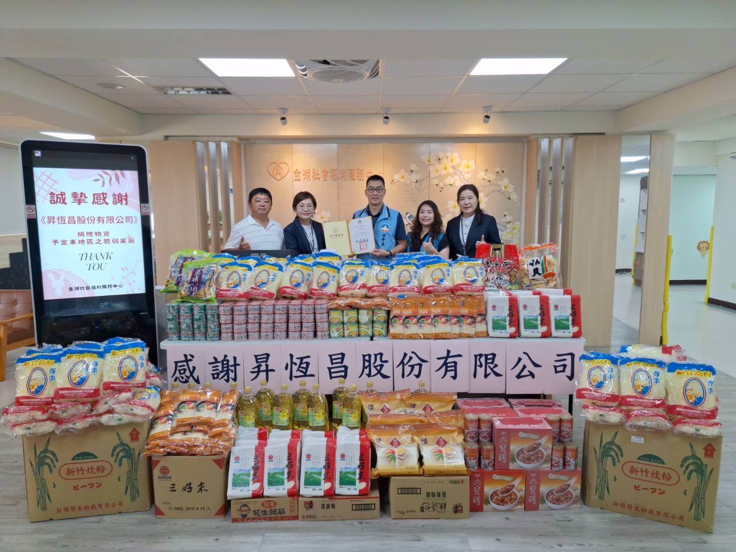 為發揮企業社會責任,持續關懷在地弱勢族群,昇恆昌股份有限公司再次展現企業善心,於10月3日捐贈一批中元普渡民生物資予金門縣政府社會處金湖社會福利服務中心。捐贈儀式上,昇恆昌金湖廣場經理劉雅均、業務經理蕭碧蓮及總務課長張偉仲代表出席,金門縣政府由社會處副處長王智育代表受贈,並致贈感謝狀以表達誠摯謝意。