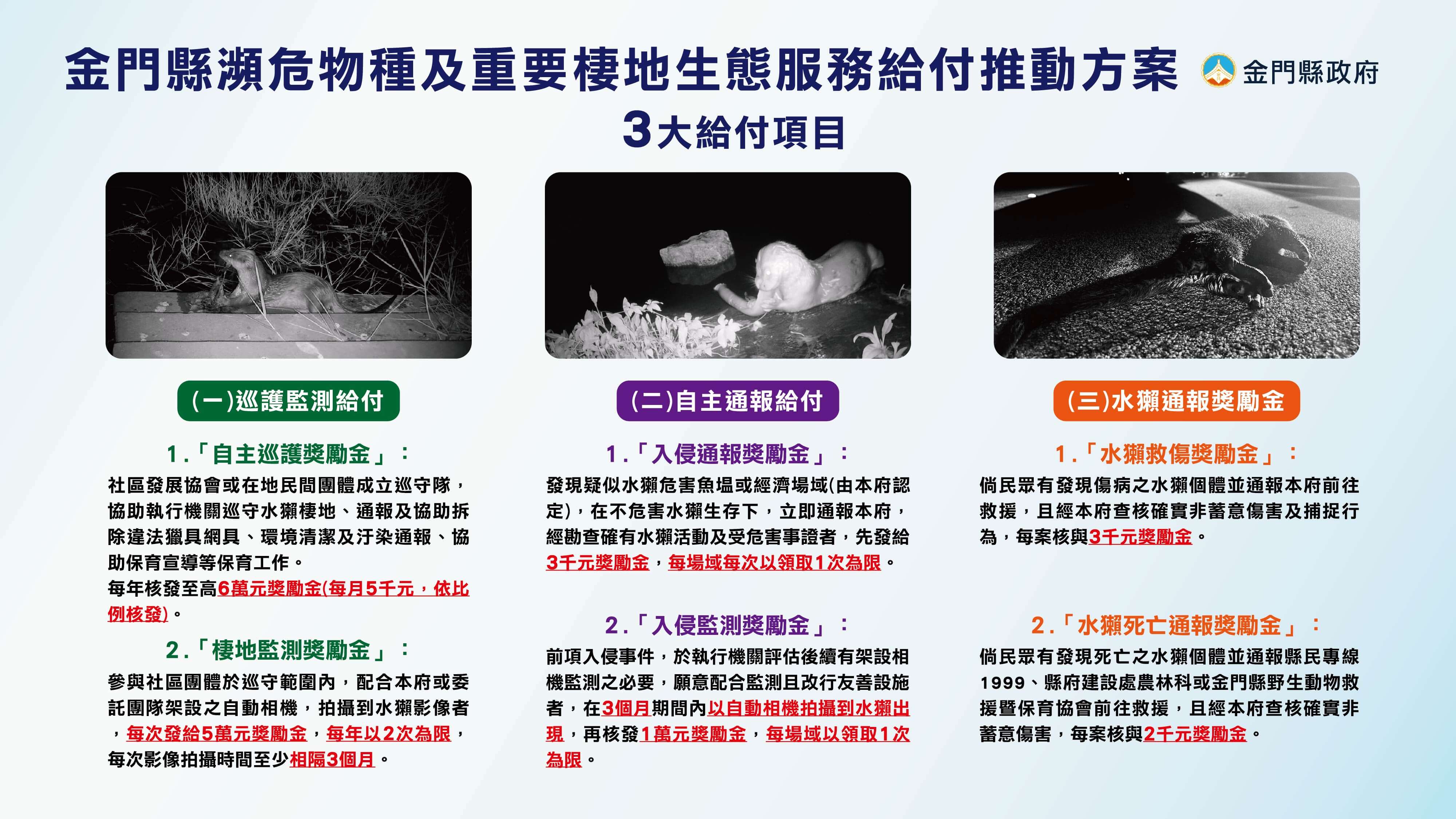 金門縣政府建設處指出,本年度給付方案,共規劃為三大項目,包含以社區為對象之「巡護監測給付」、魚塭等經濟生產區域入侵之「自主通報給付」、以及通報水獺受傷或死亡之「水獺通報獎勵金」,其中社區巡護自即日起開放申請。建設處張瑞心處長說明,自配合推動試辦方案起,社區踴躍參與成效顯著, 111年度共有21個社區申請巡守隊,透過紅外線自動相機架設,有17隊社區拍攝到水獺影像,並協助整理水域周邊環境,移除廢棄網具及垃圾,已有良好成效。
