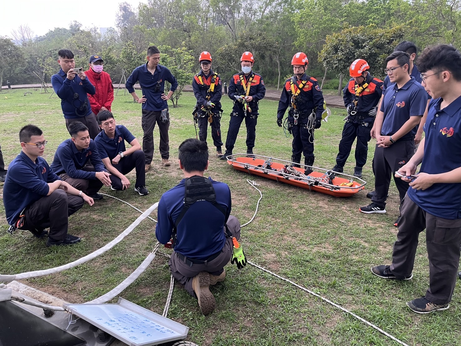 有鑑於山域救助成為新興的救援個案,分析可能造成最困難救援模式為墜落低所救助,為此,消防局第二大隊今(18)日由金湖、金沙分隊假轄區低所救助地形辦理模擬山難救助訓練,情境假設於「金湖小巨蛋」斜坡地形,模擬疑似有遊客墜落受困,由金湖分隊小隊長蔡承霖擔任教官指導,依實際救援步驟,逐步進行現場安全評估、固定點架設選擇、省力模式轉換、救援跟隨等項目,以化繁為簡、深入淺出的模式進行訓練,並配帶籃式擔架、救護及繩索救助器材,實施系統架設、省力滑車拖拉系統、低所救助吊掛救援。整體演訓由消防局督察訓練科全程督導辦理,期許透過此訓練可提供同仁到達救援現場後應實施的作為及繩索應用、固定點選擇、雙繩系統架設、省力滑輪組及上拉下放等專業技能,以及面對墜落受傷民眾的吊掛應用及確保消防人員自身安全。