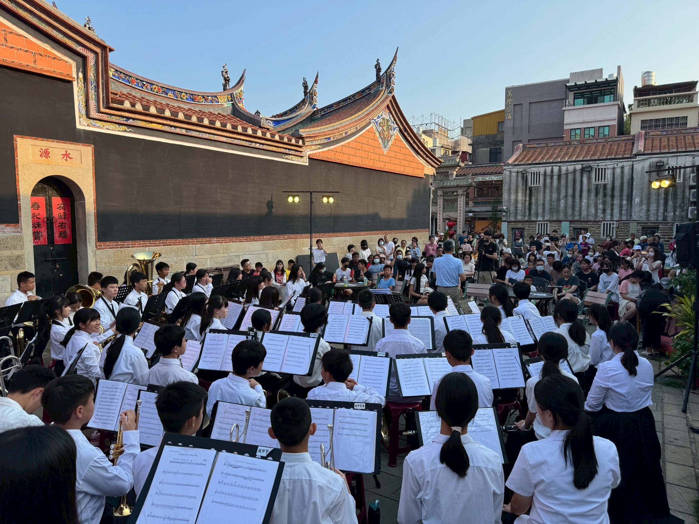 為了讓城中管樂的成果能夠與城鎮景色相互輝映,學校特別讓學生走出戶外,在金城的後浦16藝文特區進行露天的展演;在黃昏的時刻,感受動聽又激勵人心的樂曲及涼爽薰風的吹拂,跳動的音符彷彿由陳氏宗祠出發,流淌在每一個街弄巷道之間,為古樸的小鎮,帶來了非常不一樣的夜晚。動聽的音樂也讓經過的民眾及遊客,都為之駐足,聆聽著學生們每一份學習的感動。