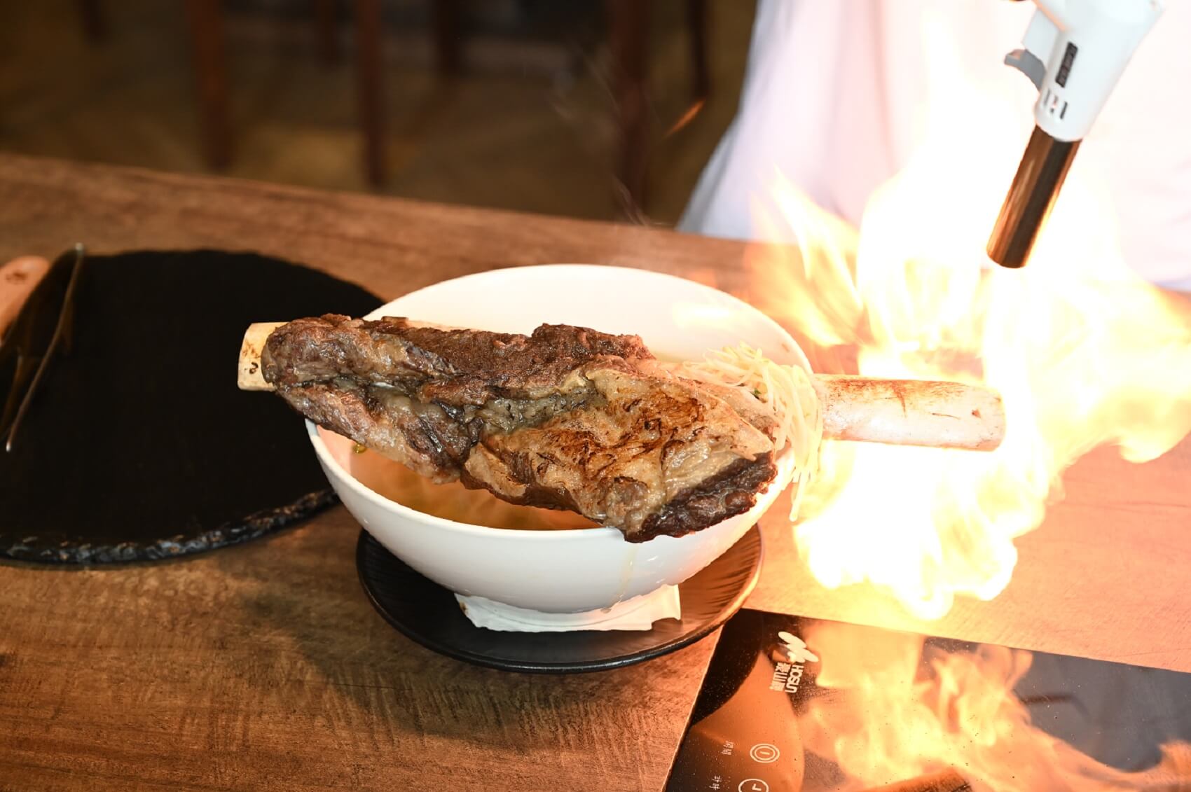 金牪「戰斧牛排家常麵」選用金門布拉安格斯母牛品種,戰斧牛排經過炙燒,逼出油脂淋入湯頭,使其更具獨特香氣。(圖/旅天下提供)