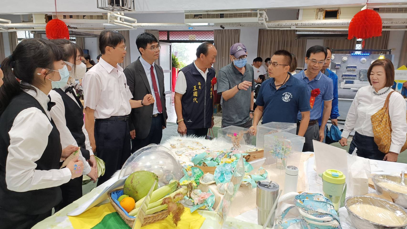 開幕典禮結束後,貴賓們參觀了本校辦理的「升學博覽會」,各科精銳盡出,充分將其特色發揮出來,會場有餐管科的特色烤肉及手沖咖啡、養殖科的烤泰國蝦及各工業家事群等的產品展出,/圖葉建雄攝