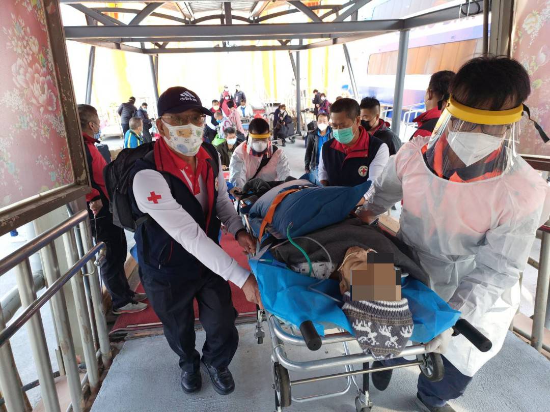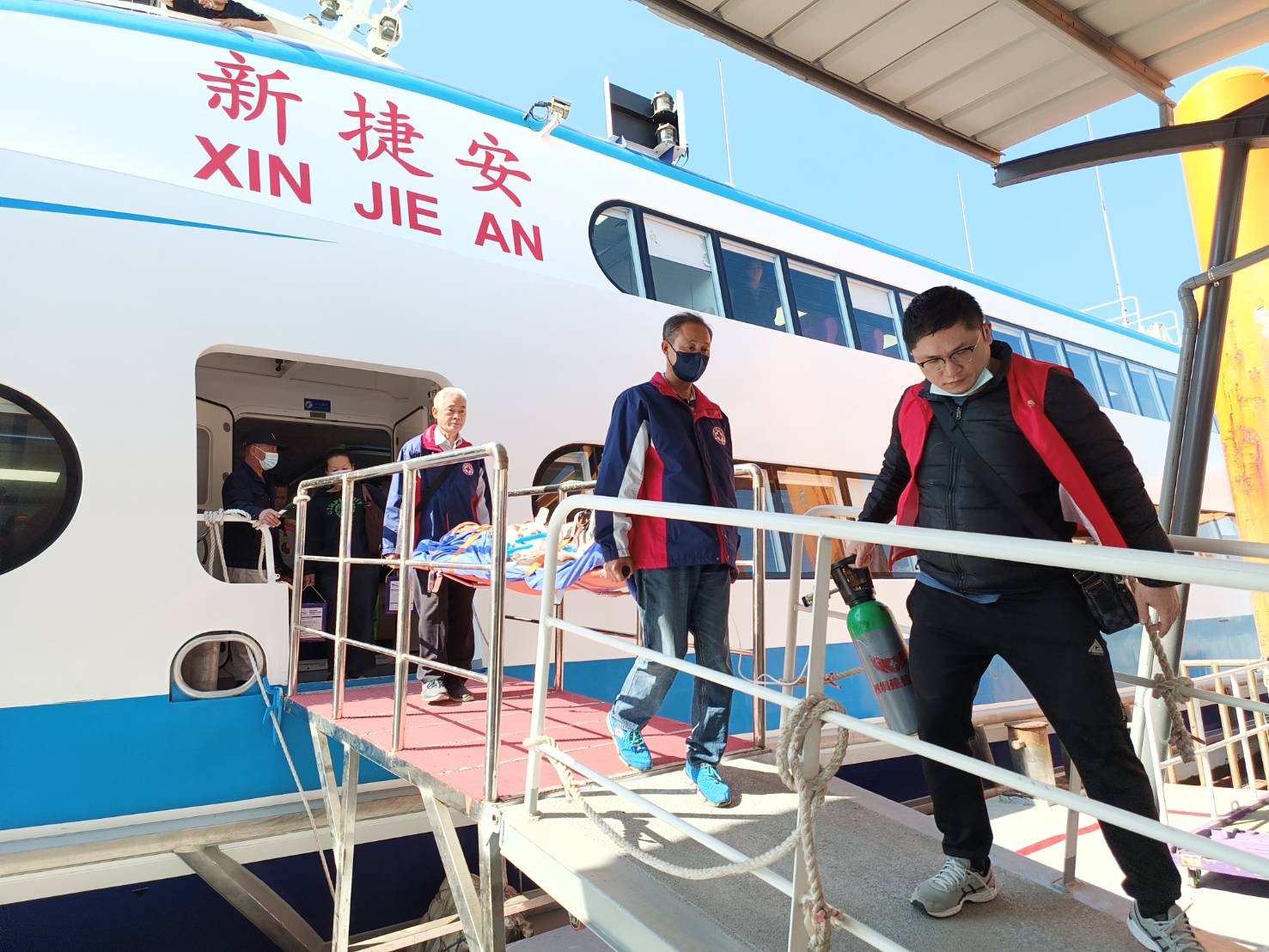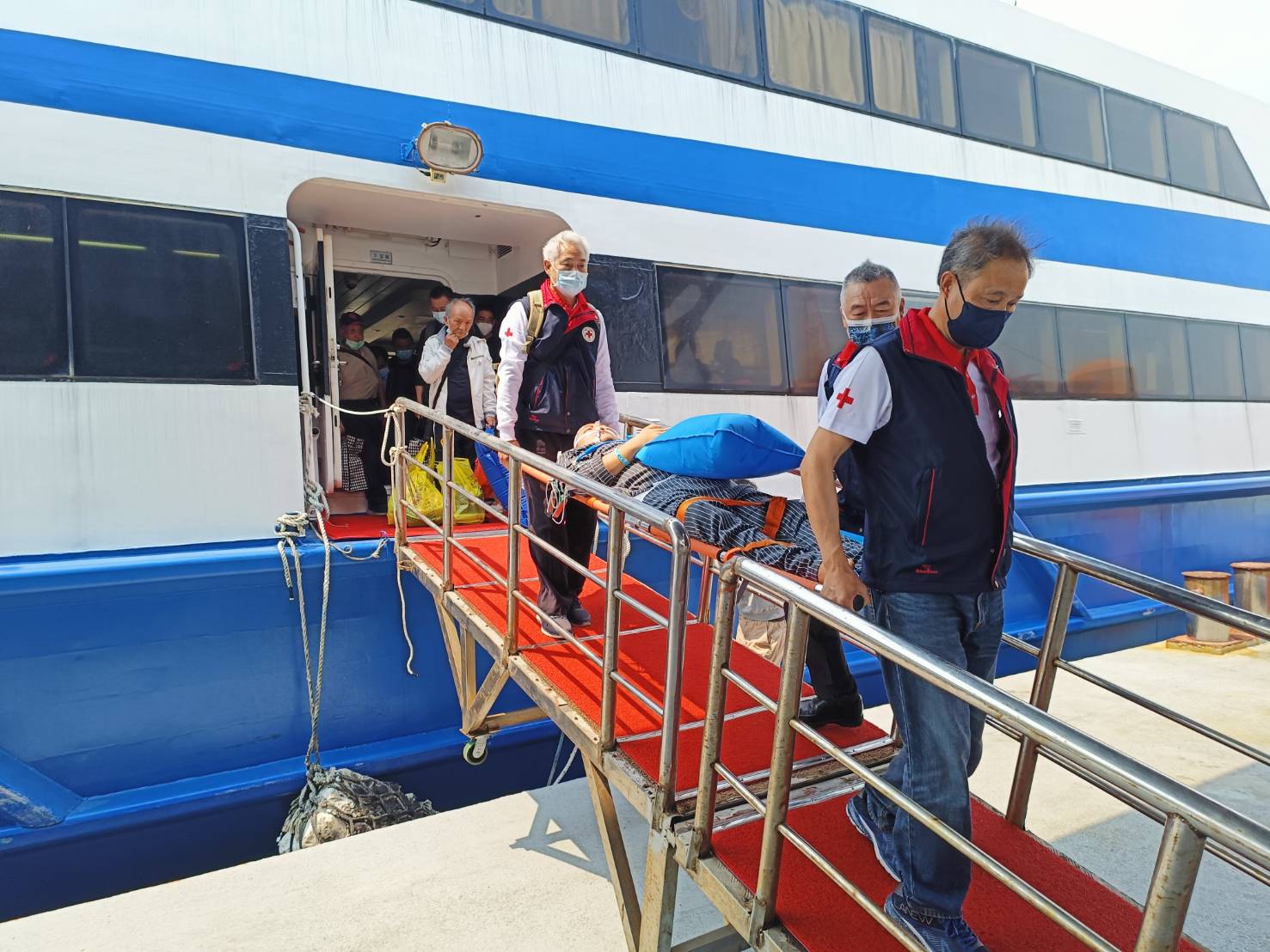 金門紅十字會人員會同醫師與家屬沿途護送病患,搭乘中午十二時三十分「新捷安」客輪回金門,並由在水頭碼頭待命的部立金門醫院救護車與護理師接手,將病患接往金門醫院觀察治療。/圖葉建雄攝