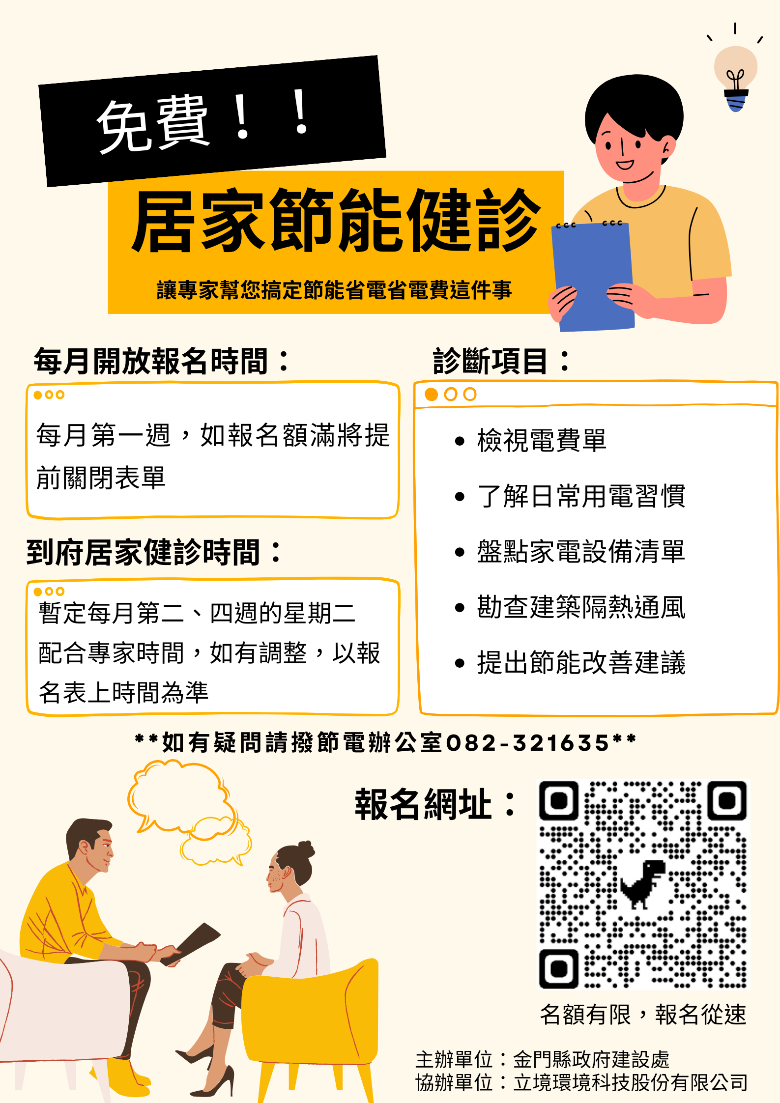 建設處提醒民眾如果對於生活上有節能相關疑問的民眾皆可至金門縣政府「住商節電專案辦公室」(縣府服務台右側辦公室)詢問,或於FB臉書搜尋「金門節能島‧幸福又美好」瞭解相關資訊,如有任何疑問也可於週一至週五上班時間(08:00-12:00,13:30-17:30)撥打服務專線:082-321635,將會有專人為您說明。