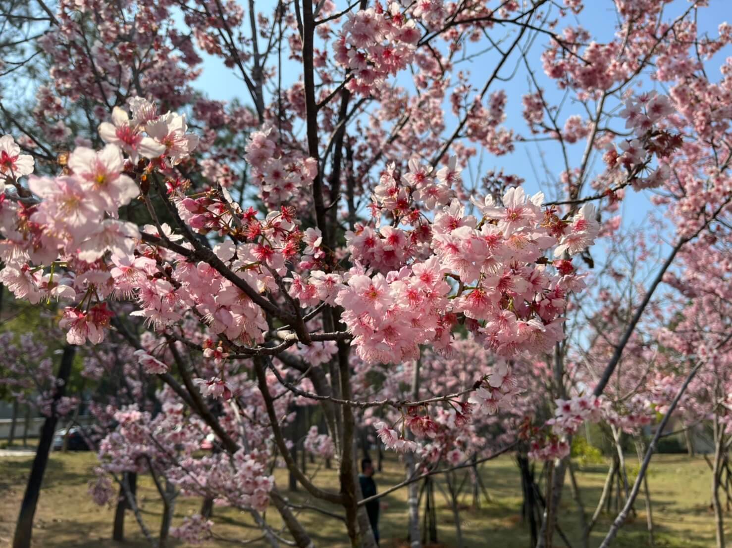 校方表示,櫻花受到天氣影響的因素非常大,目前校園內100多株櫻花已完全盛開,繁花似錦,歡迎金門鄉親和遊客前來賞櫻。/圖金大提供