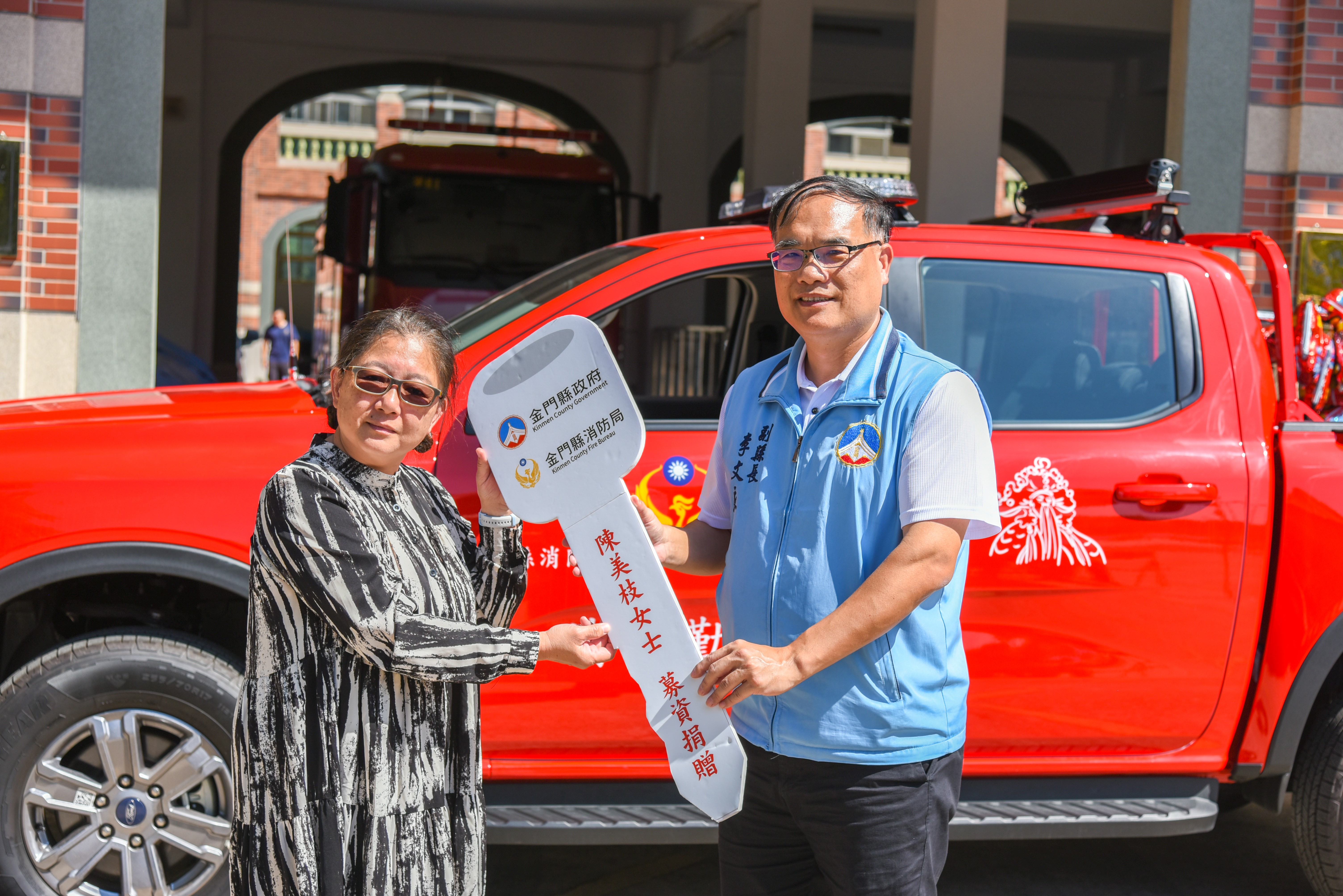 來自新竹市陳美枝女士長期投入鳳凰救護志工,發願要在今年國曆9月30日也就是農曆8月16日都城隍爺生日時,以都城隍爺名義捐贈消防車,號召超過2000人加入捐款,她分享許多不認識的人主動帶著現金來城隍廟捐款,捐贈金門消防局水域救援車1輛,10月31日於消防局金寧分隊舉辦水域救援車啟用典禮,典禮由副縣長李文良主持,陳美枝女士特從新竹市蒞金出席典禮。
