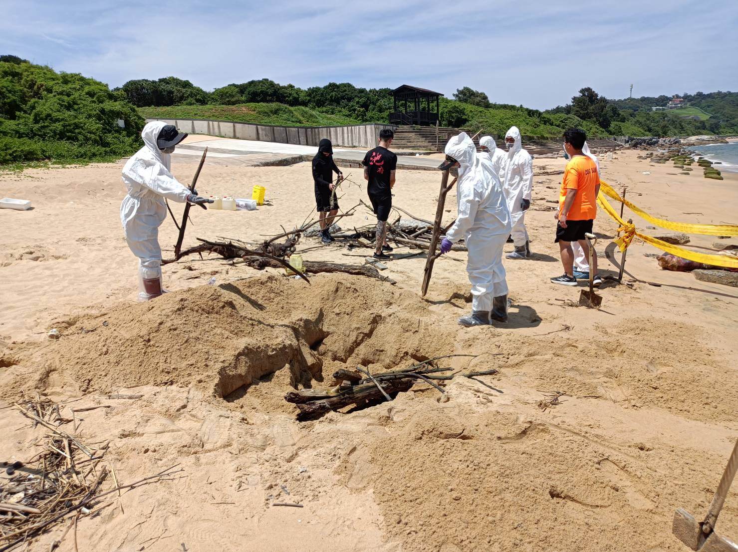 金門縣防疫所22日中午接獲海巡署金馬澎分署第九岸巡隊通報,於烈嶼鄉青岐港岸際發現一隻漂流豬屍,防疫所同仁立即赴現場執行檢體採樣及消毒作業後,就地焚燒掩埋/圖金門縣政府提供
