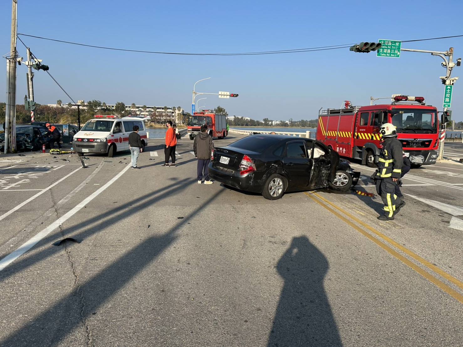 金門縣消防局救災救護指揮中心於(5)日15時51分接獲民眾報案,指稱位於金門太湖路與士校路口發生一起車禍,一輛自小客車有冒煙及駕駛受困的情況,指揮中心第一時間立即派遣第二大隊金湖分隊, 初期指揮官蔡承霖及 義消總隊李建新,總計出動各式消防車5輛及消防人員9名前往救援,現場為兩自小客車撞擊事故,兩駕駛民眾受傷,由消防同仁救出後送醫急救,詳細車禍原因有待警方進一步調查。