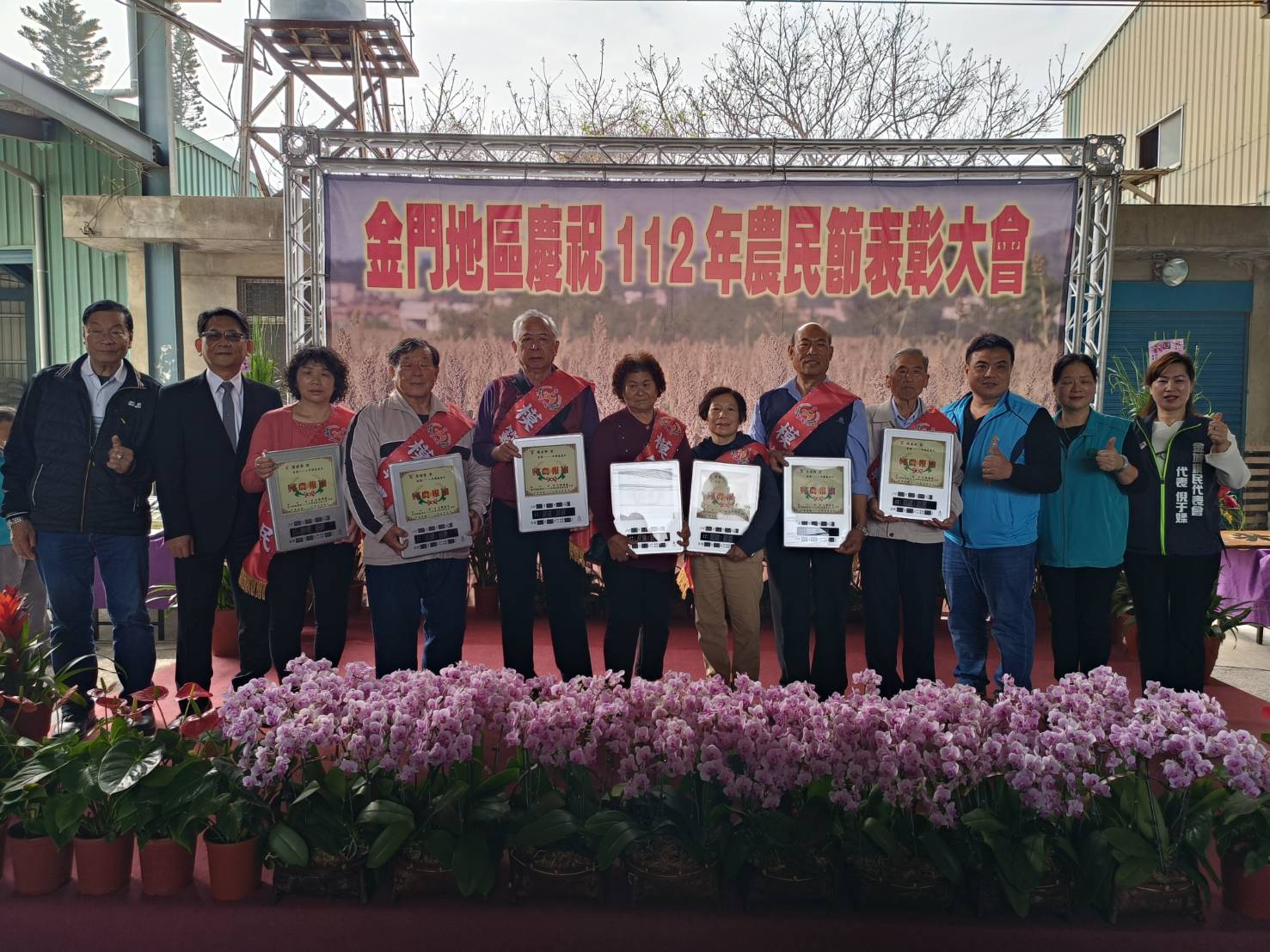 金門縣農會9日在農會乾燥中心舉行112年農民節慶祝大會,會中頒獎表揚模範農事小組長、模範農民丶安全農業示範農戶及採用地區有機蔬菜績優學校等。
