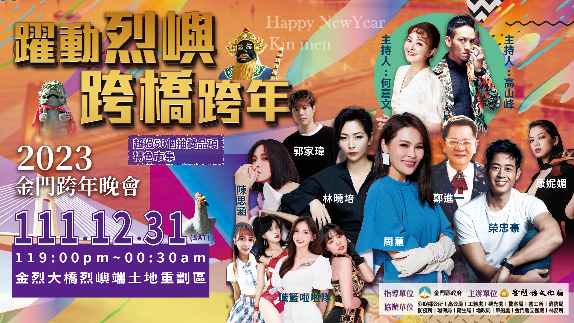 由金門縣政府指導,金門縣文化局主辦的2023金門跨年晚會預訂在12月31日(六)晚間七點,於金門大橋烈嶼端土地重劃區段舉行「躍動烈嶼.跨橋跨年」跨年晚會,超過8組金強獨家卡司陣容及在地表演團隊輪番上陣,活動內容包含市集活動、晚會表演、抽獎活動,將讓現場熱鬧滾滾,活力滿滿。此外,跨年當天無法到現場的鄉親,也可透過名城有線電視33台收看,名城有線電視全程轉播。