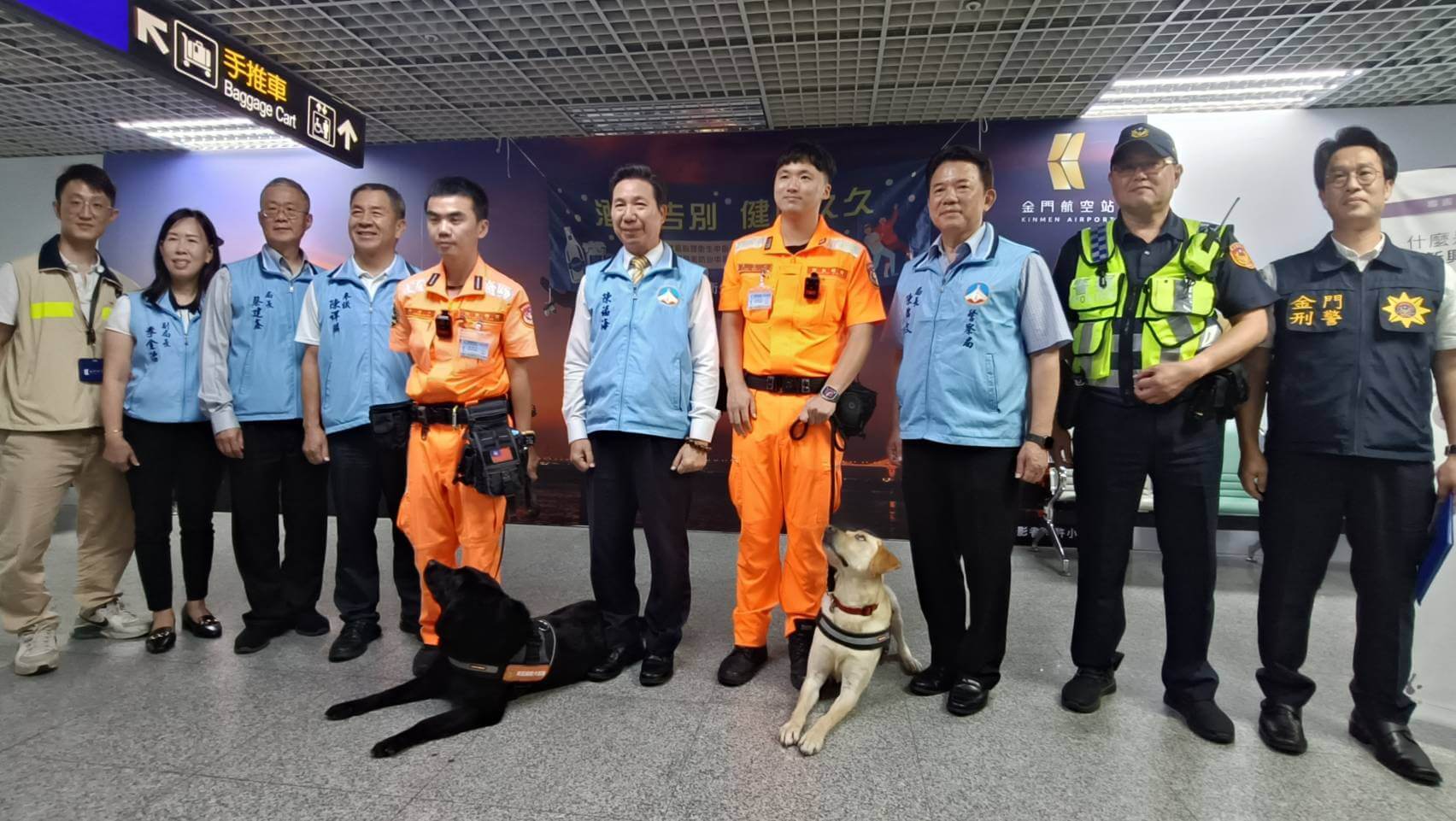 (7)日現場執勤由緝毒犬Kimo(白)及AJ(黑)針對落地各班機行李轉盤之託運行李及旅客手提行李,逐一嗅聞是否有疑似毒品之氣味,初步巡檢尚無發現不法;縣長陳福海亦於現場與兩隻可愛緝毒犬互動,勉勵犬兒要扮演好金門守護神之角色,用心聞出毒品,不要讓毒品引入金門,致使地區青少年走偏,我們將持續擴大針對郵寄及超商店到店包裹,執行緝毒犬巡檢任務,對不肖分子宣戰毒品零容忍之決心。