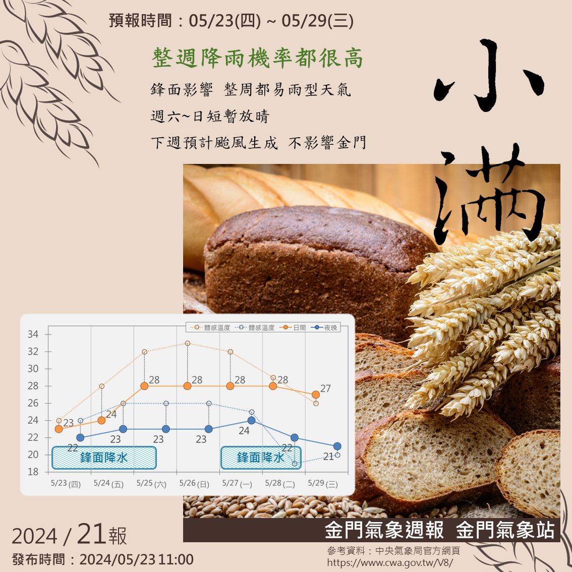 受到鋒面靠近影響,本週金門還會持續降水,比較明確會下雨的時段是在週四~六上半天(5/23~5/25),以及下週一~二(5/27~5/28),這兩段時間雨勢都很明顯,且偶爾會出現較大陣雨或雷雨,住在低漥地區的朋友要留意排水系統是否有正常運作。另外也大家出門前請看一下雷達回波,避開較強的降水。