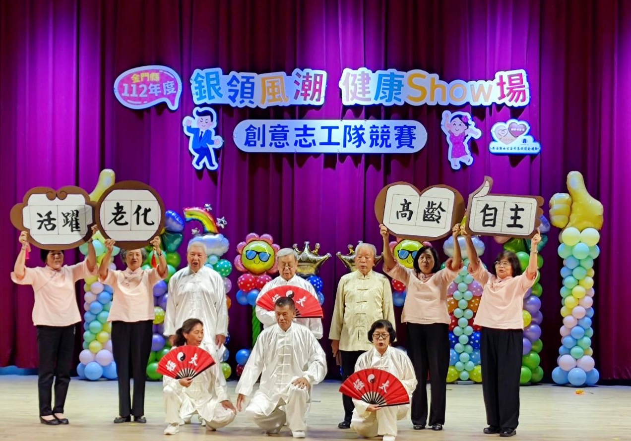 社會處志願服務推廣中心於8月26日下午在金門縣社會福利館-演藝廳舉辦「銀領風潮健康Show場」創意志工隊競賽,本次共有11支志工隊伍參加,以銀髮族為主軸的志工健康操(健康舞)競賽,參加競賽的志工隊包括:金湖鎮塔后社區綜合福利服務志工隊、金門縣婦女會-金鳳凰志工隊、金門縣政府政風處廉政志工隊、金門縣銀髮族祥和志工隊、烈嶼鄉青岐社區岐心志工隊、金湖鎮下莊社區志工隊、金湖國小志工隊、金湖鎮新市社區綜合福利服務隊、金湖鎮信義新村社區綜合福利服務隊、金湖鎮武德新莊祥和志工隊及金湖鎮山外社區綜合福利服務隊等11隊。銀領風潮健康Show競賽榮獲佳績隊伍分別為冠軍:金湖鎮信義新村社區綜合福利服務隊,亞軍:烈嶼鄉青岐社區岐心志工隊,季軍金湖鎮武德新莊祥和志工隊,最佳帶勁獎:金門縣婦女會金鳳凰志工隊。銀領風潮健康Show競賽全縣總共129隊志工隊,提供表演競賽平台讓長者展現健康活力與生命價值,達到社會參與目的,激發志工團隊精神及創意潛能,以自創輕鬆健康、充滿創意的健康操(或健康舞),塑造各志工隊與眾不同的特殊風格,亦加強地區志願服務團體之間的聯繫及情感交流,使志工們能群策群力,為促進本身及協會成員甚或地區居民健康樂活盡一份心力。