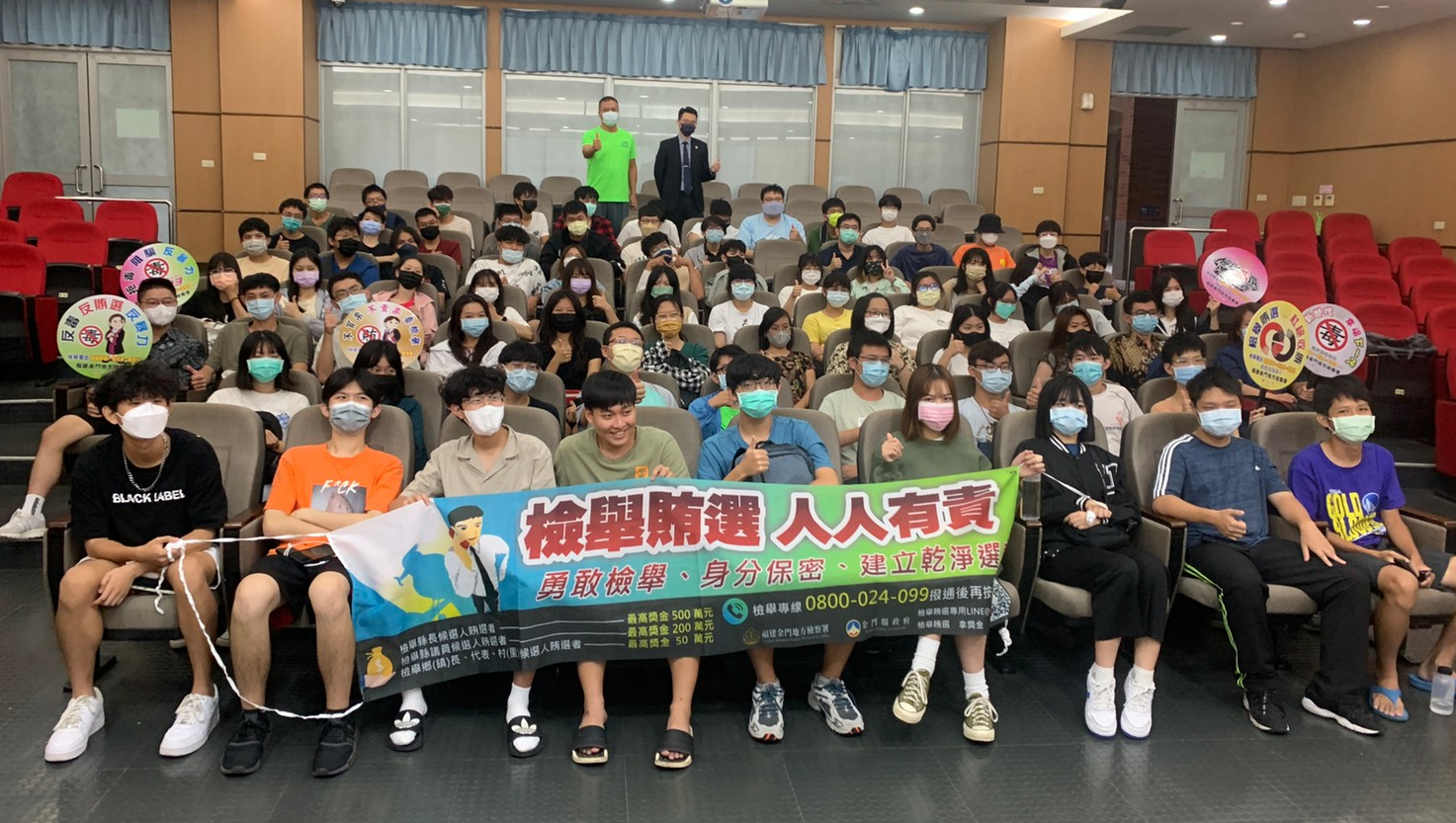 為因應111年11月26日地方公職人員選舉到來及提升學生的法治素養,以杜絕賄選黑手伸入校園,金門地檢署劉主任檢察官特於10月5、18日前進金門大學校區進行「反賄選宣導-防止金錢、暴力介入校園」講座課程,除強調本署查賄、反賄之決心外,更讓學生能認識反賄選的重要性,協助建構正確法治觀念。