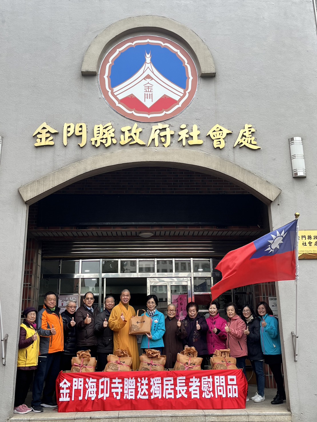 金門縣太武山海印寺住持性海法師與真化師父帶領社團法人金門縣佛教弘法基金會董監事代表洪志合、王漢文、陳金盛、呂忠飛、許明坤、許秀治、吳素蘭及張含麗等人,於1月23日上午攜帶保暖圍巾207份,委由金門縣政府社會處轉送全縣獨居長者,由社會處黃雅芬處長等陪同代表接受,黃處長並代表陳福海縣長致贈感謝狀乙紙,感謝太武山海印寺弘法基金會長年來對本縣獨居長者關懷與照顧。