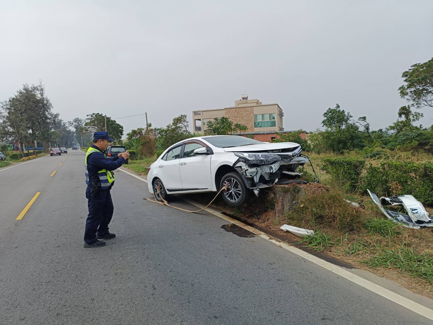 汽車駕駛疑似精神不濟,衝入對向車道撞上路樹及營區圍牆/圖葉建雄攝
