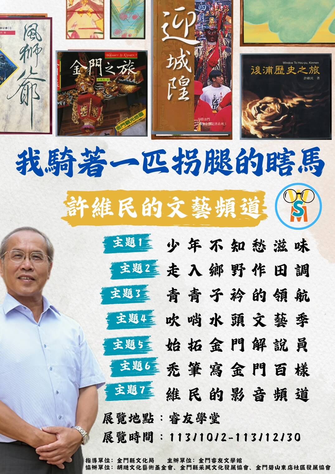 金門睿友文學館113年文學推廣活動,10月2日起將展出金城國中退休校長許維民,以「我騎著一匹拐腿的瞎馬」為題的七大主題展。內容有多年來從事田調以及創作成果,藉由展覽一一回顧。展覽訂於10月2日下午2時在睿友文學館廣場舉行開幕式,將邀請金門縣合唱團、國立台南藝術大學音樂系高中部學生周妍等到場演出,歡迎鄉親以及藝文同好到場共襄盛舉。