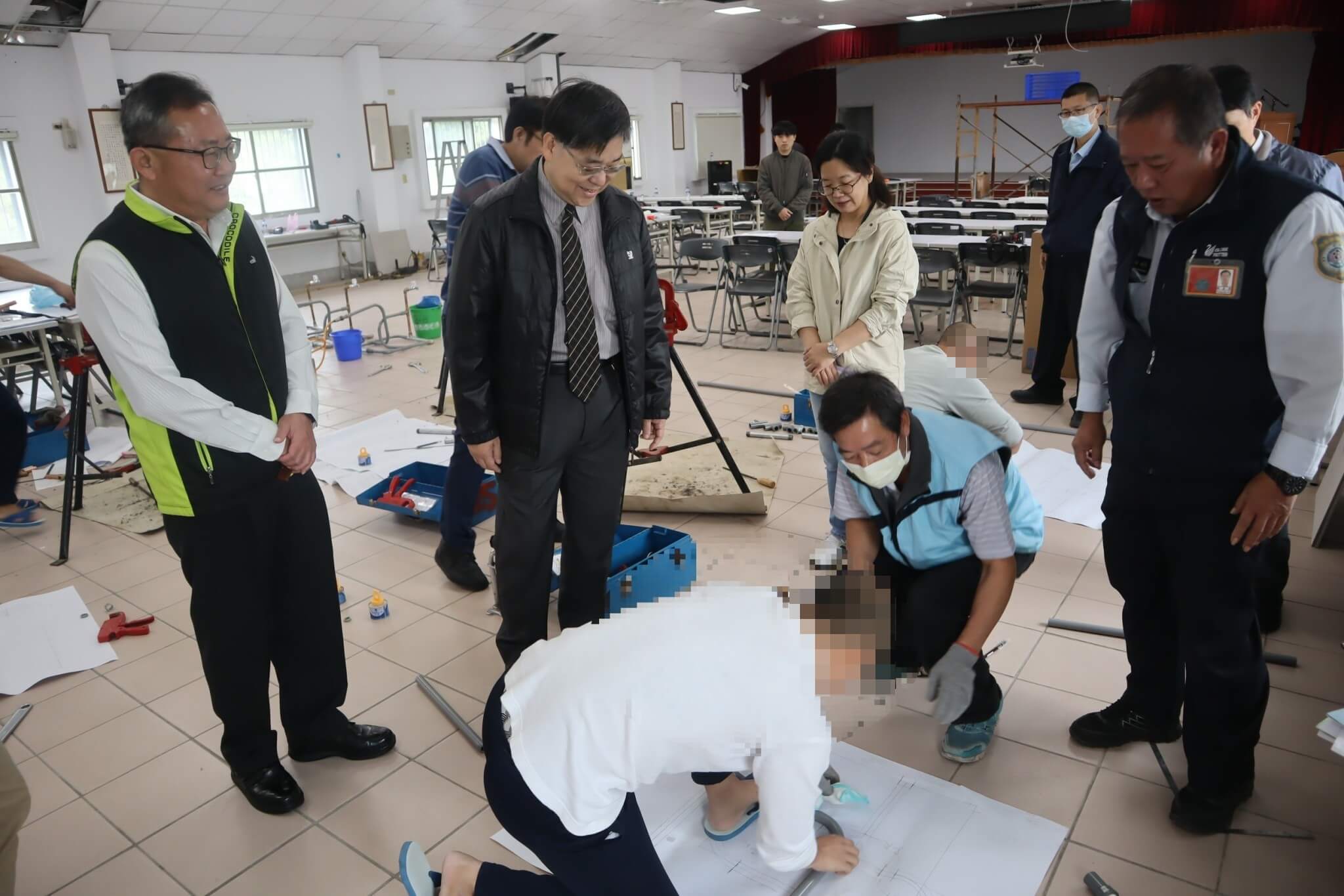 福建更生保護會毛有增董事長(福建高等檢察署金門檢察分署檢察長)於放榜後,立即撥冗蒞臨金門監獄,偕同楊戶政典獄長及金門高職指導老師等,與正如火如荼加緊術科實作練習的同學們加油打氣,一起分享這份喜悅與榮耀。/圖金門˙更生保護會