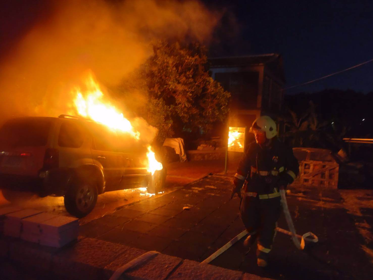 金門男撞人肇逃又自撞護欄引火燒車 偵查隊長目擊逮人變救人 /圖葉建雄攝