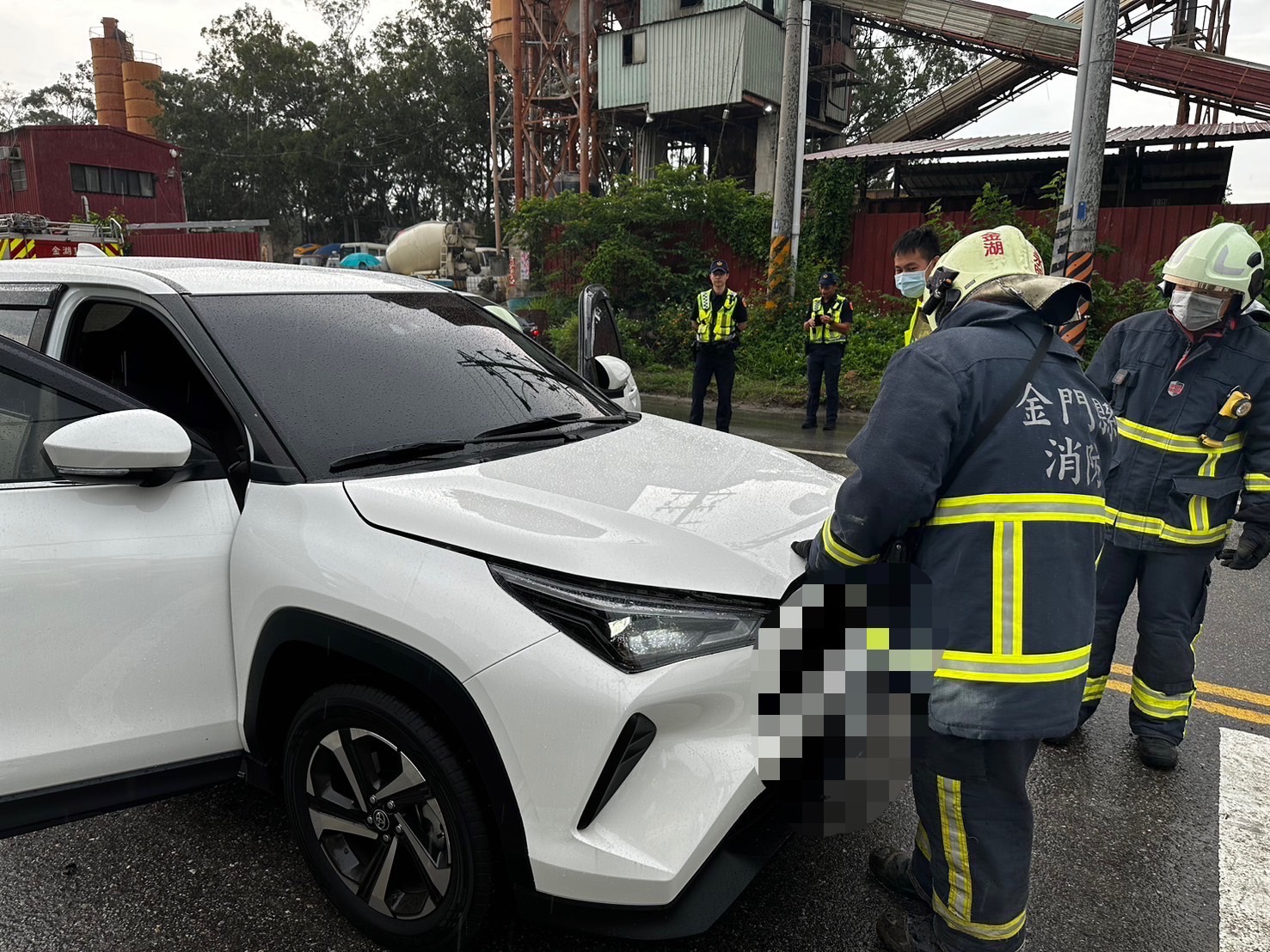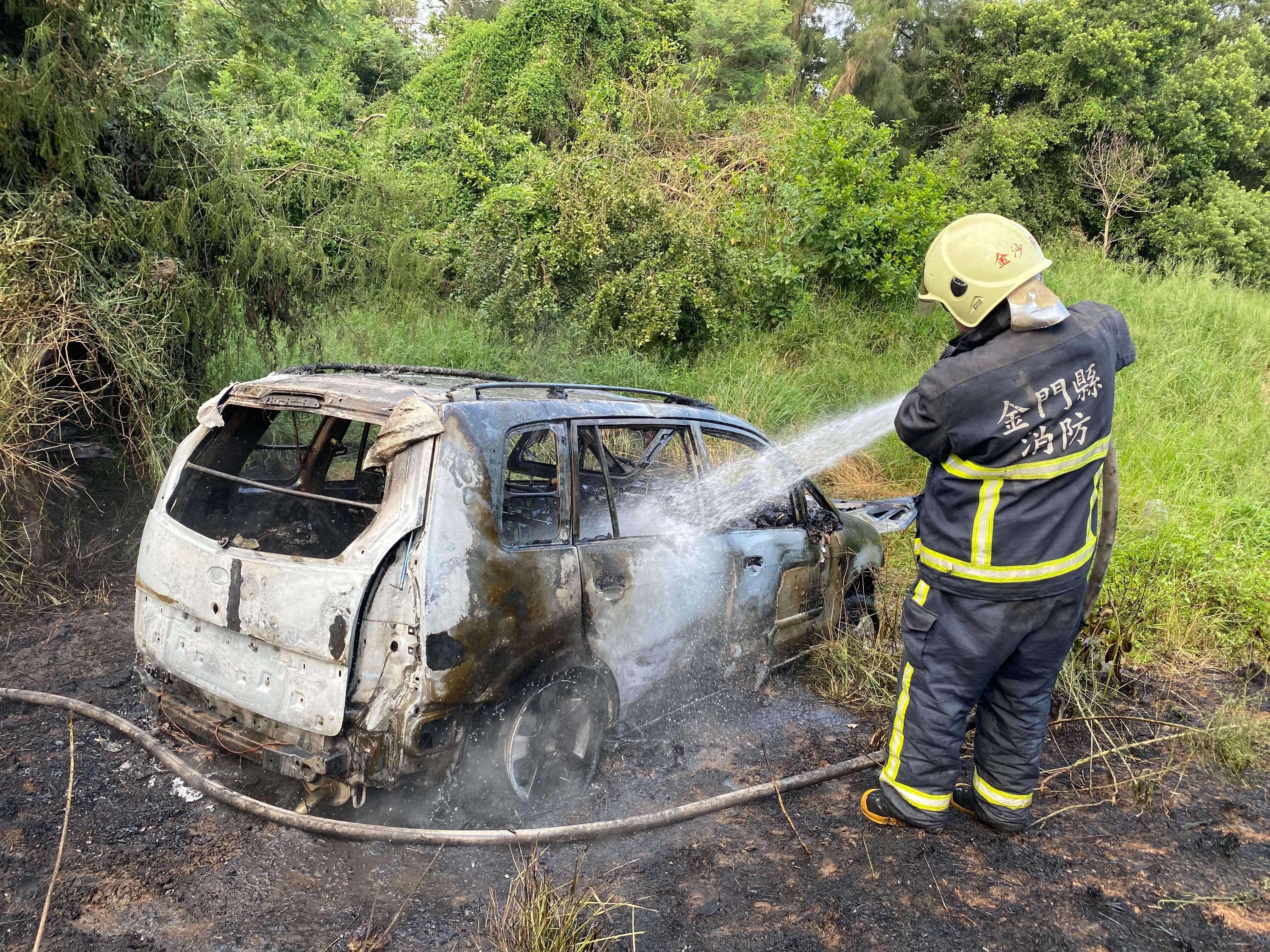金門消防局車組抵達車禍現場後,經現場指揮官觀察,該自小客車車頭全面起火燃燒,所幸受困駕駛與乘客第一時間由一旁路人救出,車組人員初期以滅火器進行火勢壓制,後續佈署水線搶救火勢,並確認有無其他人員受困車內,過程運用破壞器材針對車頭進行必要破壞,以確認無復燃之疑慮;另兩名受傷民眾由救護人員給予必要救護處置後,送往金門醫院救治,整起救援在現場消防及警察合作下順利完成搶救任務。