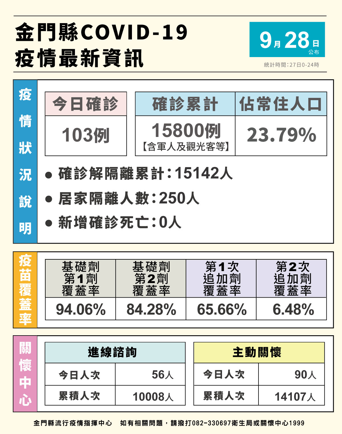 地區指揮中心今(28)日公布金門地區新增103例COVID-19確診者(統計時間27日0-24時)。確診者累計15,800例,約占本縣常住人口23.79%;確診者解除隔離15,142例。地區指揮中心再次強調,本縣每日公布之確診人數,係以實際在本縣醫療院所就診之民眾進行統計,除實際居住者外,也包含軍人、觀光客等外來確診個案。