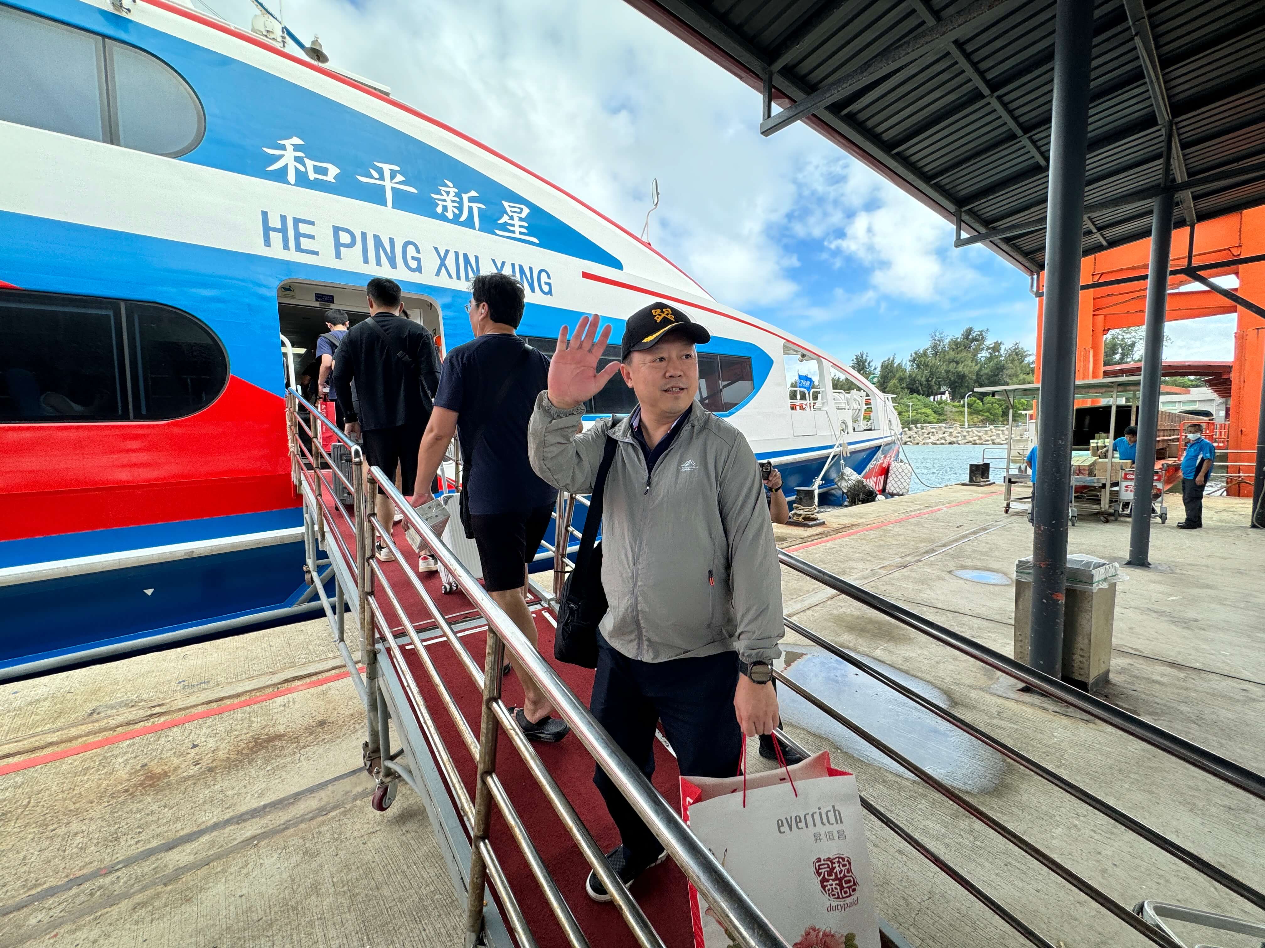 首發大陸廈門旅遊踩線團已結束3天2夜考察行程,今(20)日下午2時30分搭乘和平新星輪經小三通返回廈門,團員們說金門的特產都很不錯,該買的都買好了,廈門旅遊協會祕書長林峰還說會常來,團員們上船後還頻在窗邊揮手,依依不捨。