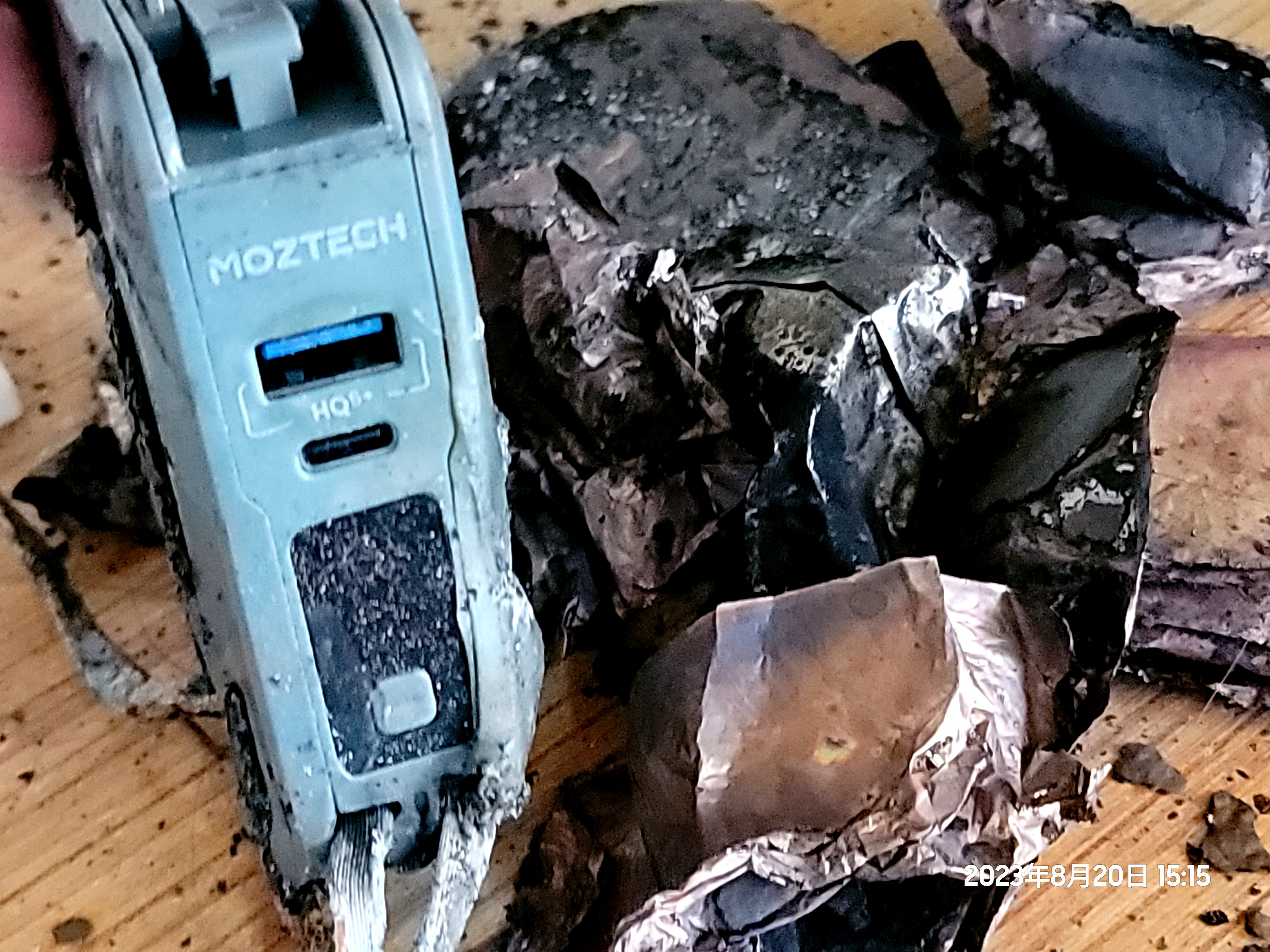 這位李姓民眾表示,這款「萬能充Pro行動電源」是他在去年12月14日花了千餘元購買的,使用至今還不滿一年,他在本月18日早上七、八點左右醒來時,這顆行動電源已經在爆炸燃燒,由於爆炸時仍插在插座上擔心釀更大災害,便盡快從插座上移除並放置到地板,過程中不慎液體濺到而受傷。事發至今,李姓民眾指出,因為擔心再度發生意外,所以現在若是要為手機或是行動電源充電時,一定會有人在旁,連睡覺時都不敢再為任何機器充電。