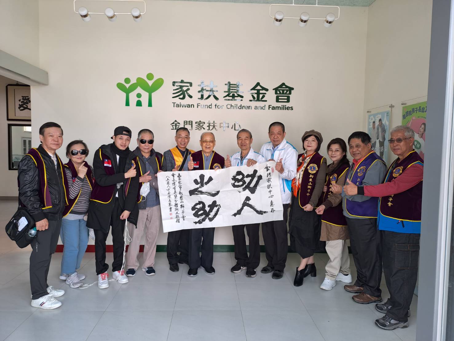 國際獅子會300A1區台北市新象山獅子會於二十九日早上十時,藉由三天兩夜金門公益之旅,一行成員由新象山獅子會會長陳有昇的聯繫下,前往金門家扶中心進行社會服務活動,關懷金門地區的弱勢兒童和家庭,同行成員共計捐出八萬餘元,並由前中正國小陳坤乾校長贈送墨寶一幅,表達對家扶中心扶幼工作的支持和肯定。此次跨海的慈善活動,由家扶中心扶幼主委楊肅謙代表家扶中心,接受此次獅兄和獅姐們的愛心,並獻上誠摯的感激之意。家扶中心主任李桂平並介紹不同於本島,離島特殊的兒童扶助工作,以及家扶中心兒童扶幼館的功能。