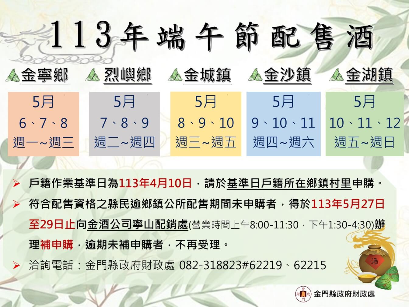 113年端午節配售酒各村里售領現場作業將自5月6日(一)陸續展開,依次為金寧鄉5月6日(一)至8日(三)、烈嶼鄉5月7日(二)至9日(四)、金城鎮5月8日(三)至10日(五)、金沙鎮5月9日(四)至11日(六)及金湖鎮5月10日(五)至12日(日),縣府財政處提醒鄉親如果於113年6月10日(含)已設籍本縣連續滿4年,並已年滿18歲,取得一般配售資格,請於各鄉鎮配售期間向各村里配售點洽購,申購後之提貨單請於提領期限113年6月17日前(營業時間上午8:00-11:30,下午1:30-4:30)至寧山庫提領酒品。