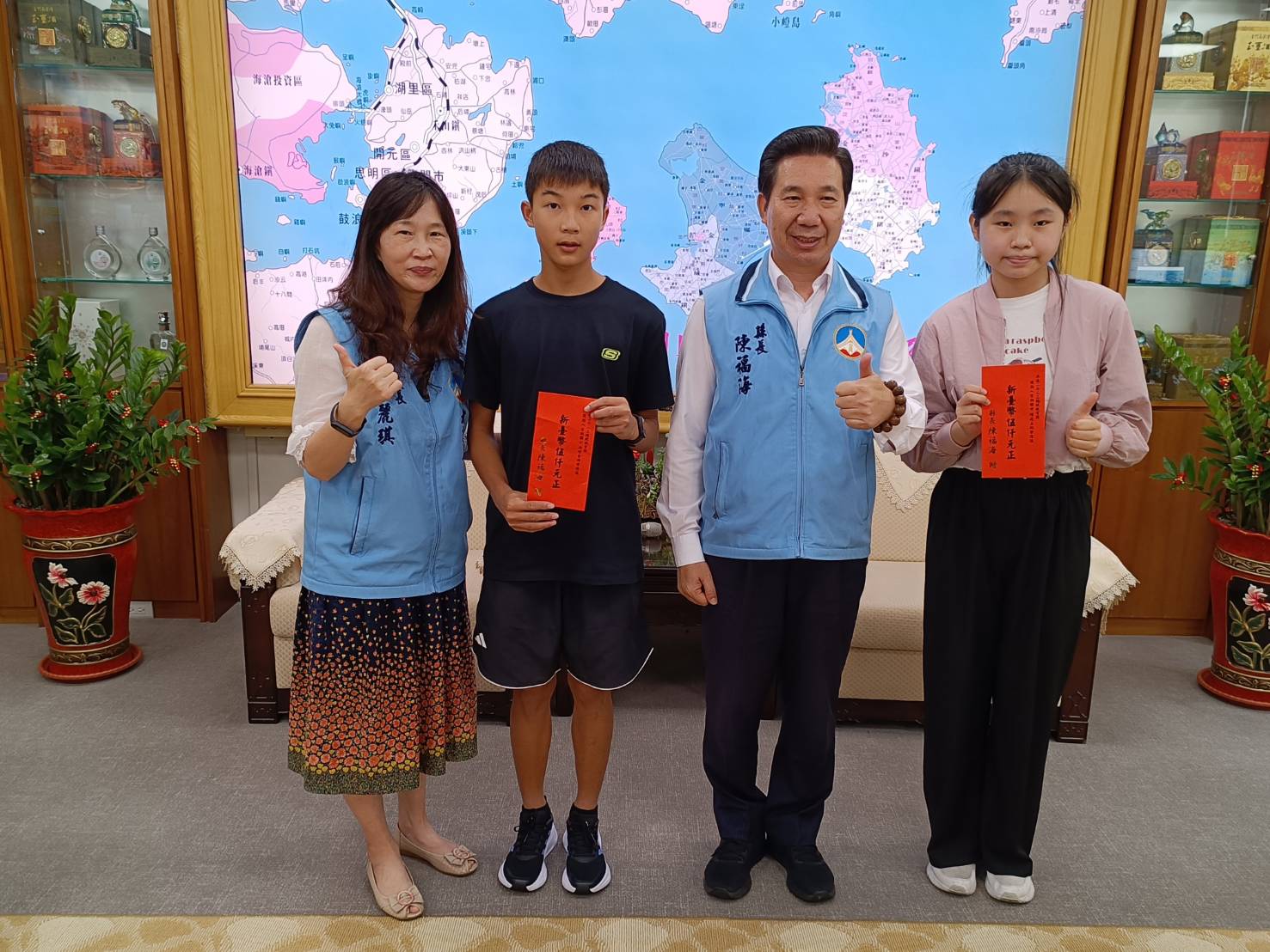 金門縣長陳福海19日上午,在教育處孫麗琪處長陪同下,於縣長室接見2023總統教育獎獲獎的古城國小洪偉豪、金湖國中陳庭玉兩位同學,致贈程儀為獲獎同學勉勵壯行外,並就在學各項學習情形關懷垂詢,讚揚古城國小洪偉豪、金湖國中陳庭玉兩位同學,能在全國351人推薦名單中,出類拔萃.脫穎而出,如今得以榮獲2023總統教育獎,實屬不易。兩位同學即將赴台參加7月7日星期五於總統府舉行頒獎典禮,由蔡英文總統接見,並頒發獎狀獎座及獎學金,以資鼓勵。