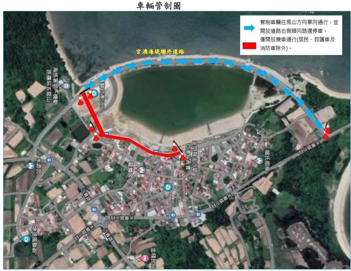二、 官澳海堤聯外道路,往官澳村內龍鳳宮前道路至官澳長青會路段,僅開放機車通行(居民、救護車及消防車除外)。