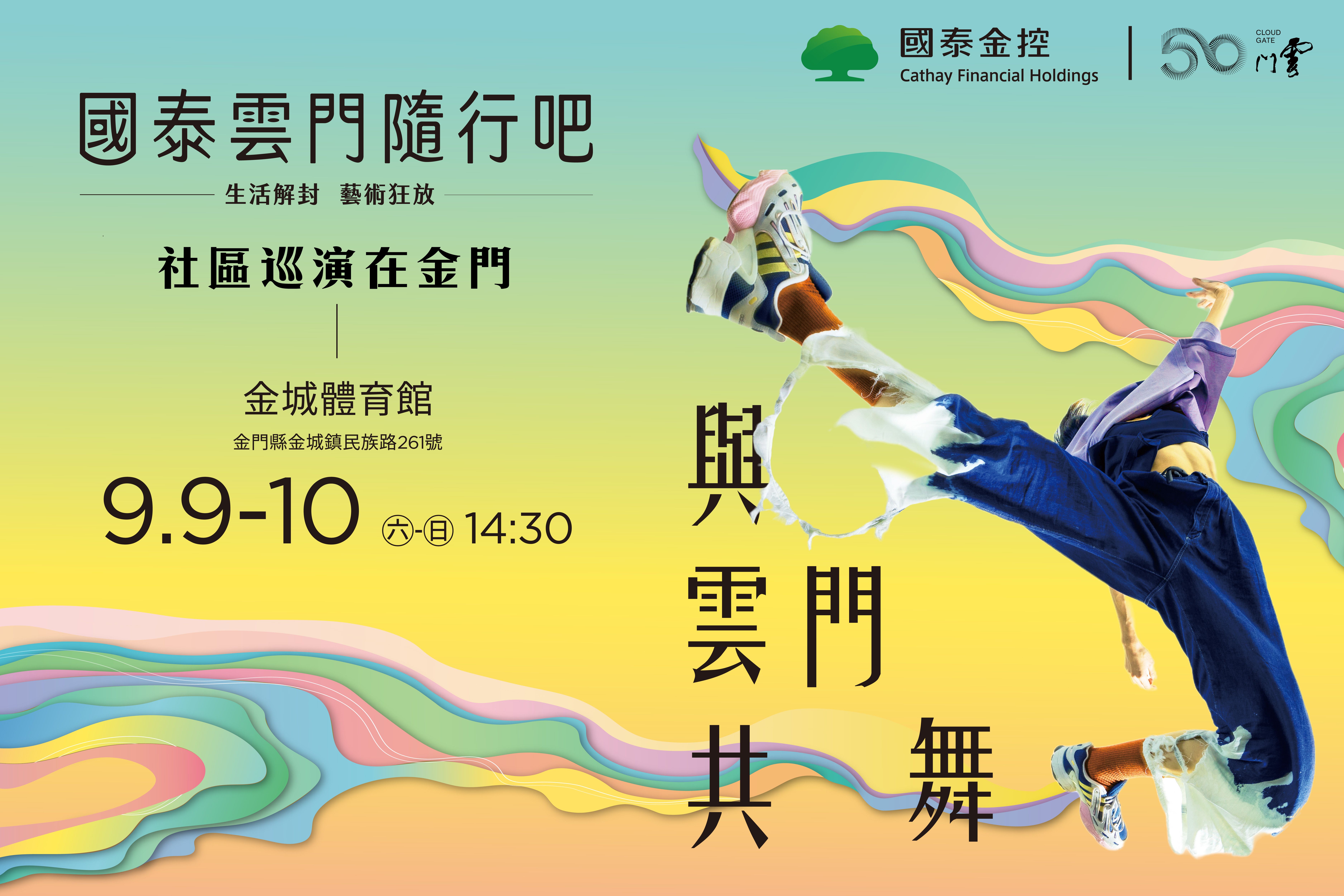適逢雲門50週年,國泰金控與雲門舞集合辦國泰雲門隨行吧「與雲門共舞」金門場次,將於今(2023)年09月09日(六)與09月10日(日)下午2:30在金門縣立體育場金城體育館與民眾一同共舞。「國泰雲門隨行吧」今年帶來「生活解封、藝術狂放」的理念,期待生活如同藝術般全力揮灑,讓每位民眾更加放心去體驗藝術。