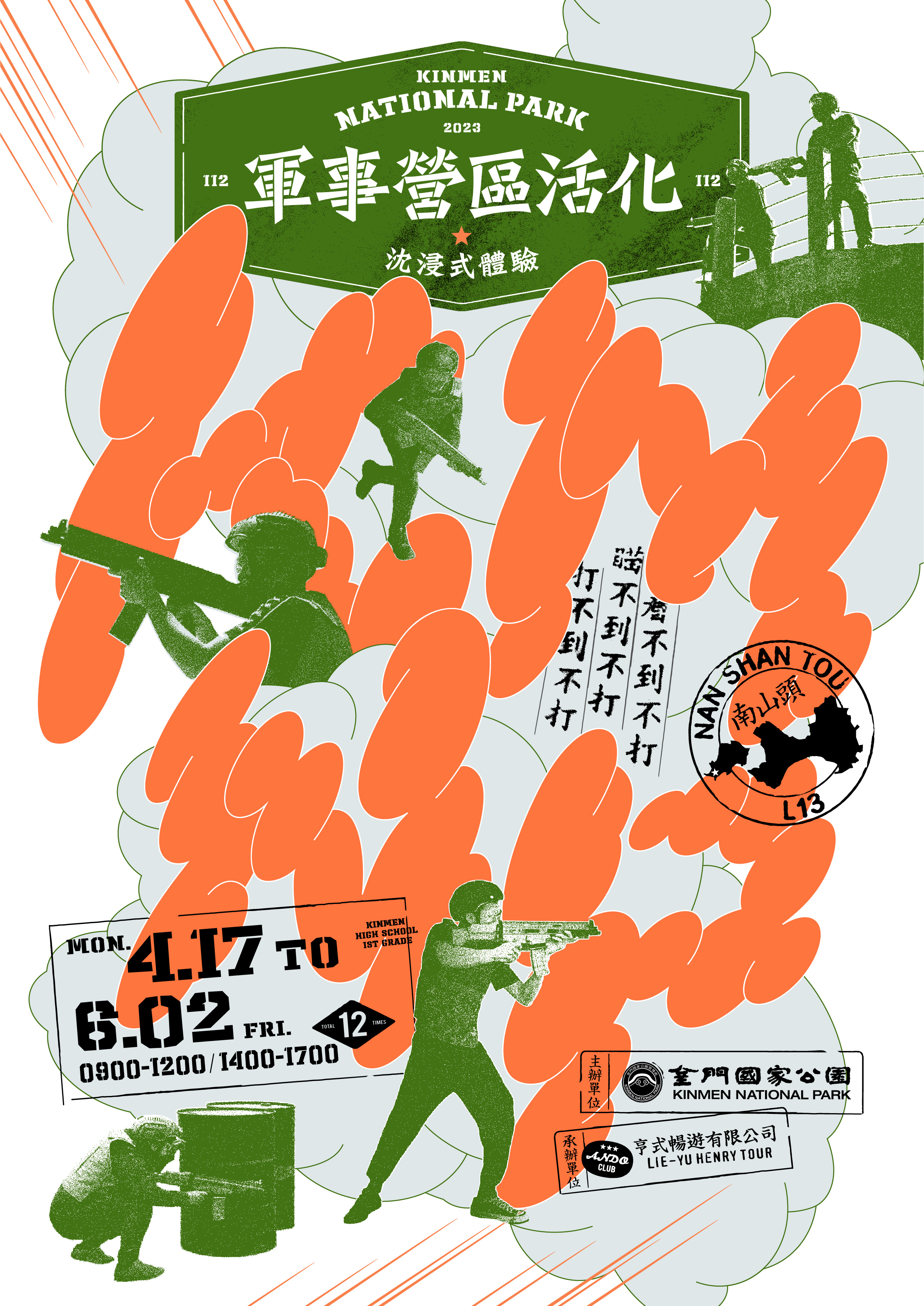 今年度辦理「112年軍事營區活化沉浸式體驗」共12場次,以烈嶼南山頭四營區作為環境教育場所,規劃3小時之體驗內容,邀請金門高中老師及一年級學生一同回顧戰地歷史、精神標語、戰略位置、據點設計目的等內容,並進行水彈射擊體驗。活動首先針對營區據點進行深度剖析,並於後續的關卡、模擬射擊體驗中,帶入前面學習的內容,藉此瞭解烈嶼的軍事分布歷史,體驗軍事營區存在之價值。
