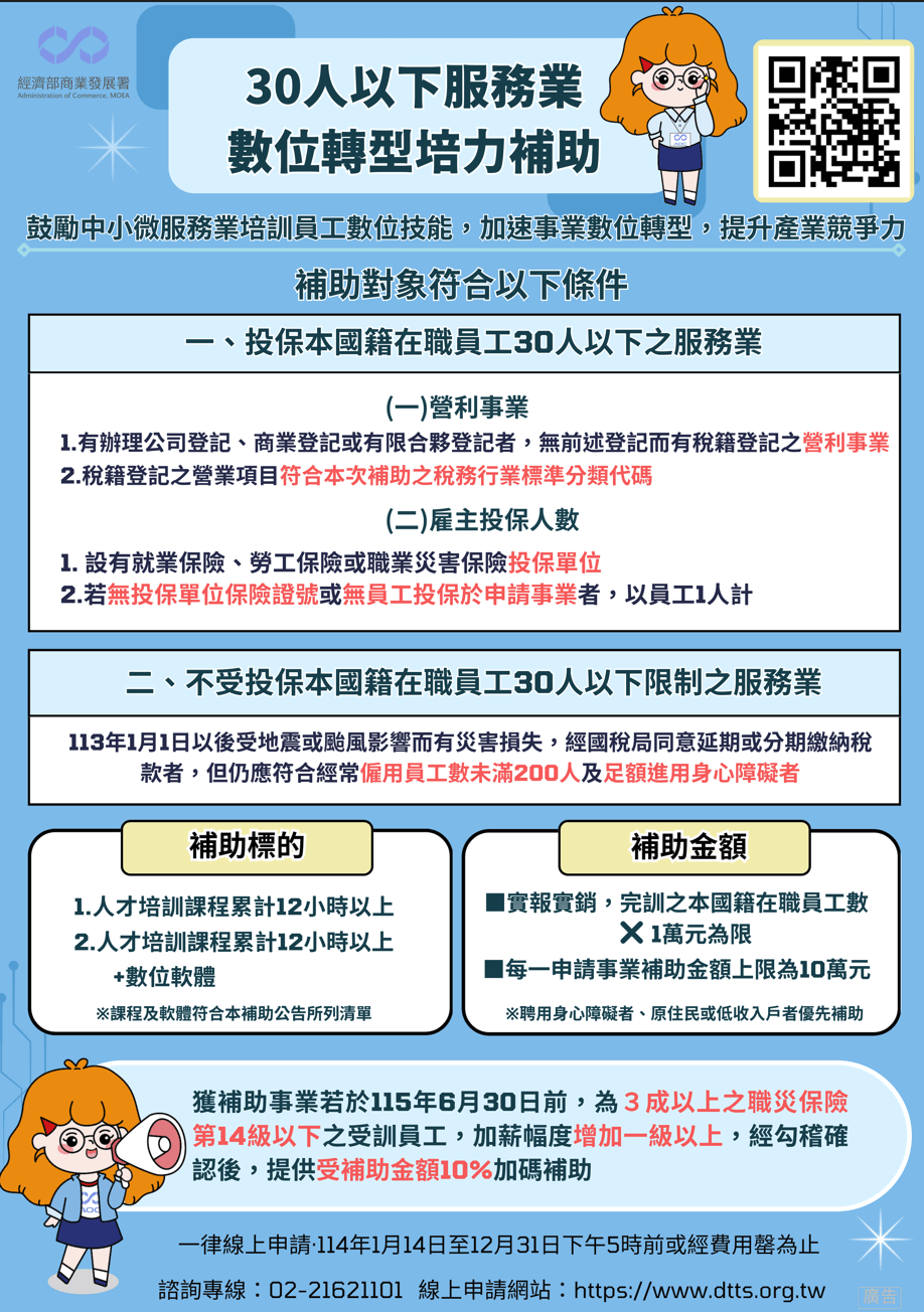 中小微型服務業迎來數位轉型關鍵時刻!為鼓勵30人以下服務業導入人工智慧應用,經濟部商業發展署推出「30人以下服務業數位轉型培力補助」,金門縣商業會獲金門首家開辦「生成式AI應用班」,課程符合補助對象資格者,企業參訓員工每人可獲最高1萬元補助,單一事業最高補助10萬元,優先補助聘用身心障礙、原住民或低收入戶者,協助企業無痛升級、加速轉型!